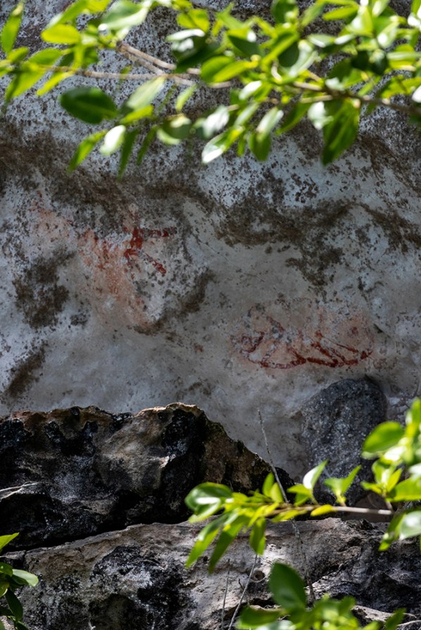 Of course, he was joking. He and RD returned to pick us up, and soon we were speeding in and out of more islands. Any time Finn spotted something notable, like a local bird species, we would slow down to look at it. At one such juncture, Finn pointed up to a bare patch of rock about seventy feet above us on a cliff face. I had to squint to see it, but the rock was streaked with simple shapes done in red paint. These were what still remain of a set of ancient Palauan pictographs.