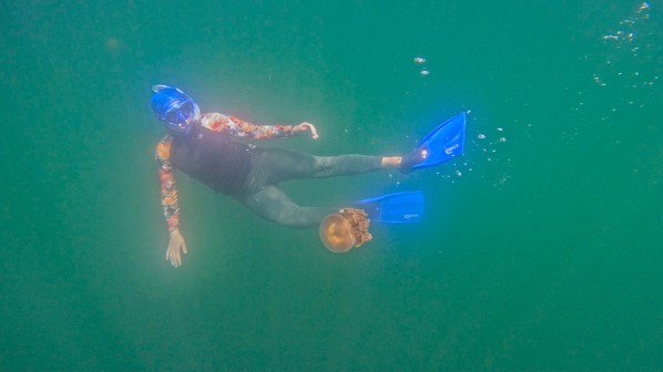 We swam passed the cardinalfish, and headed toward the sunniest spot in the middle of the lake. Golden jellies are in a symbiotic relationship with a single celled alga called zooxanthellae. The jellies provide a home for the zooxanthellae, and the zooxanthellae provide nutrition for the jellies. Zooxanthellae photosynthesize, which is why the jellyfish can be found in the sunniest part of the lake at any given time of the day.
