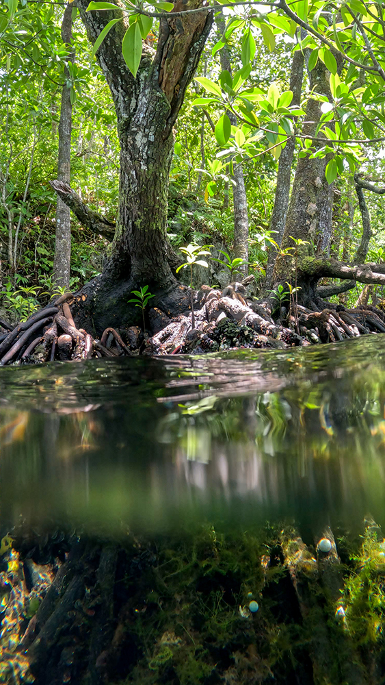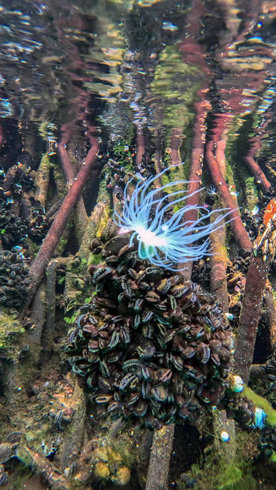Surprisingly, jellyfish weren’t the only interesting creatures to see in Jellyfish Lake. Finn led us over to the edge of the lake where tangled mangrove roots dipped into the water. He pointed out a wispy, white anemone affixed to a root and explained that these anemones prey on the golden jellies.