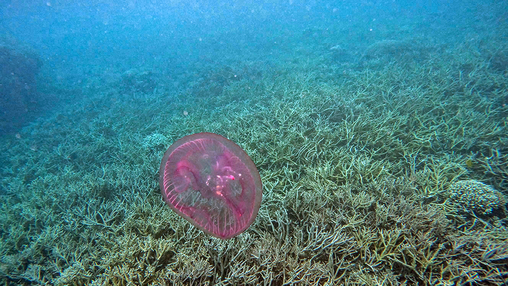 Before 2019, Jellyfish Lake was filled to the brim with millions of golden jellies, a subspecies of Mastigias Papua that lives only in the marine lakes of Palau. But Golden jellies prefer cooler water than many other jellyfish species, so when a La Niña hit Palau in 2019, the jellies didn’t reproduce, resulting in a dramatic drop in their numbers. Golden jellies reproduce by two means. Either Asexually by budding off of polyps that are affixed to the lake’s walls, or sexually when mature medusas produce larvae. These larvae swim to the edge of the lake, where they attach and become polyps. When the water gets too warm, the polyps don’t produce more medusas, although they remain dormant, attached to the lake edges. Recently temperatures have come back down, and the jellies have started to make a slow comeback, but a full recovery will take some more time. For now the lake has a lot more moon jellies, which thrive in warmer water.