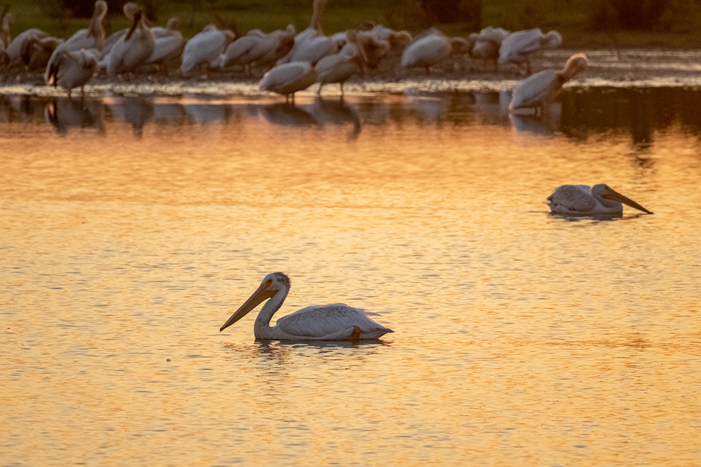 There was a large flock of white pelicans swimming through a lake whose waters reflected the brilliant sunset. Unlike brown pelicans, who live on Oregon’s coastlines, white pelicans stick to shallow, fresh waters in the State’s interior. They’ve become more common near Portland in recent years and have been staying later into autumn than they used to. The northwestern US is summer breeding ground for them, and they migrate south during the winter.