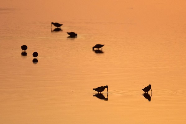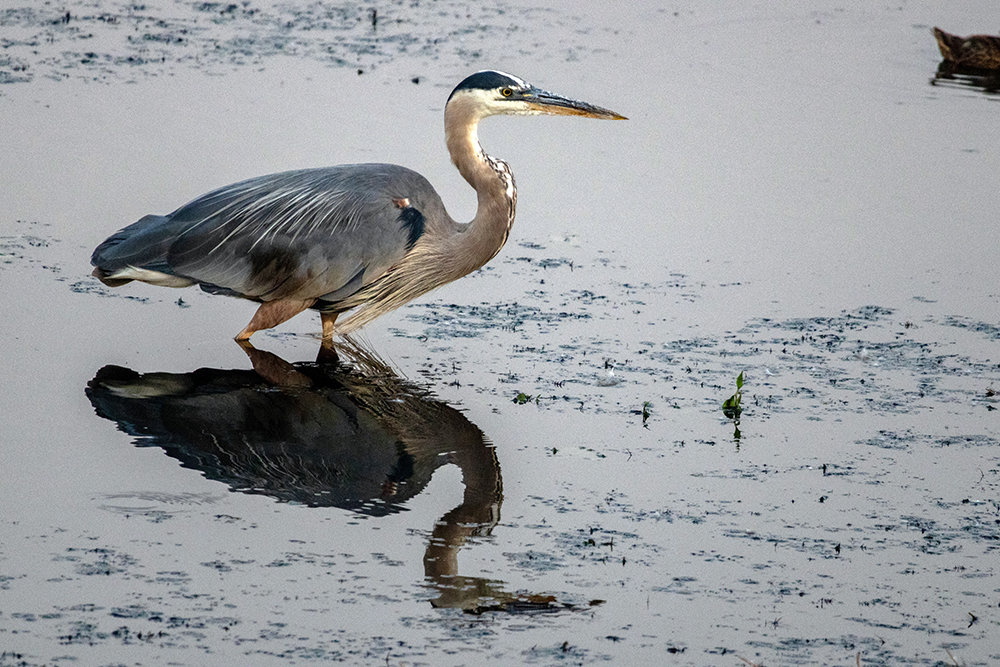 Great blue herons peered down at us from the white skeletons of dead trees that stood tall in the water. A barn swallow swooped in a wide circle around us before landing on a fence post. A flock of sandpipers of some sort waded in the shallow water, silhouetted against the sun. There were birds in every direction we looked.