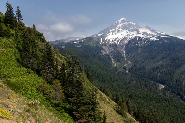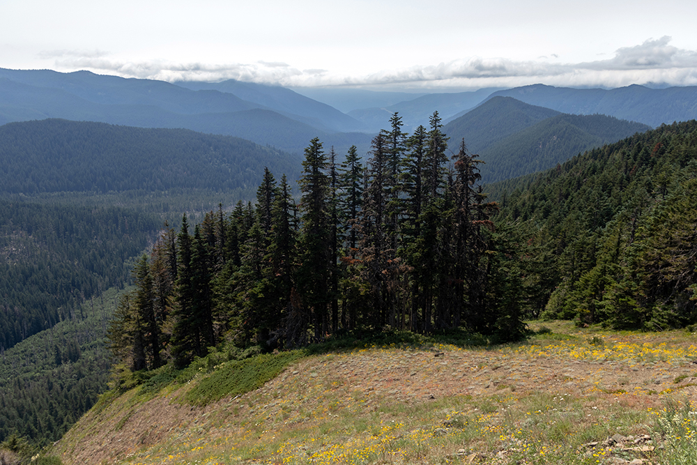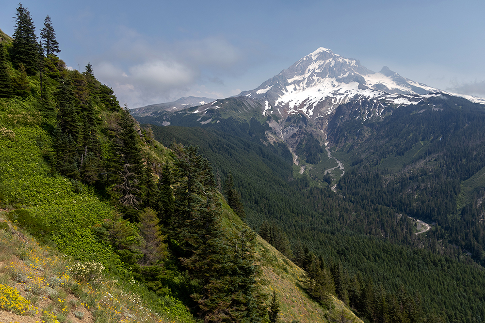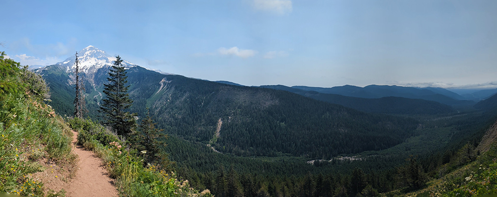 We kept walking down the trail until it reentered the forest. From there, we could keep hiking for several more miles to get to another viewpoint, or turn around and head back to the car. None of us were prepared for a much longer hike, so we decided to turn around and retrace our steps. That meant that we got to enjoy the same amazing view one more time on the return trip. This really was the most perfect day you could ask for in the mountains, and I kept turning back to look at Mount Hood every few minutes until we made it back into the forest once again.