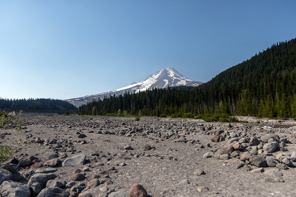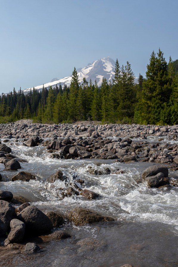 It was a quick hike back to the car from there, and when we arrived, we decided to drive around the mountain to check out one more scenic viewpoint for the day. Andrew drove us over to White River Sno Park, a popular access point for cross country skiing and sledding in the winter time. On this summer afternoon, we had the park to ourselves though, and we enjoyed a beautiful view of the babbling White River as it flowed down from the snow fields of Mount Hood.