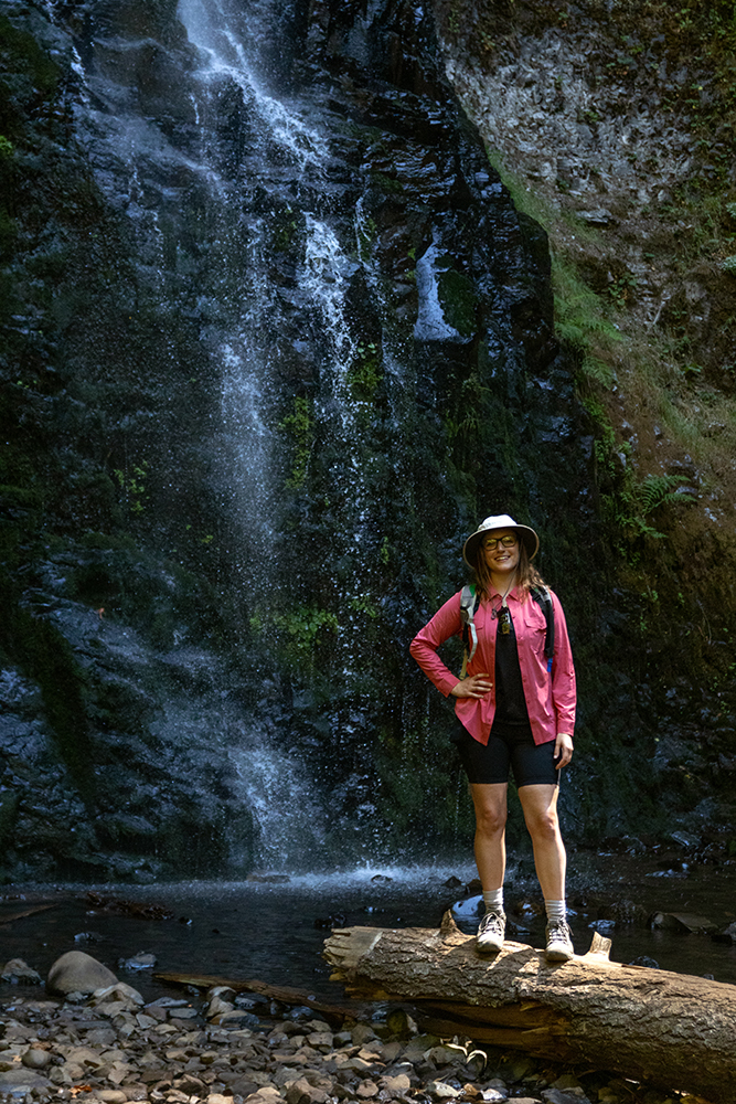 The narrow trail that led to the base of Double Falls opened up to a view of a dizzyingly tall basalt cliff with a thin stream of water running down two tiers of rock. Even though the fall was a bit dry in the mid-summer heat, this still ended up being my favorite one of the day. I liked that it was tucked back off the main trail a ways because it made the area feel more secluded. We got to walk right up to the base of the waterfall, where we craned our necks upward to look up at it.