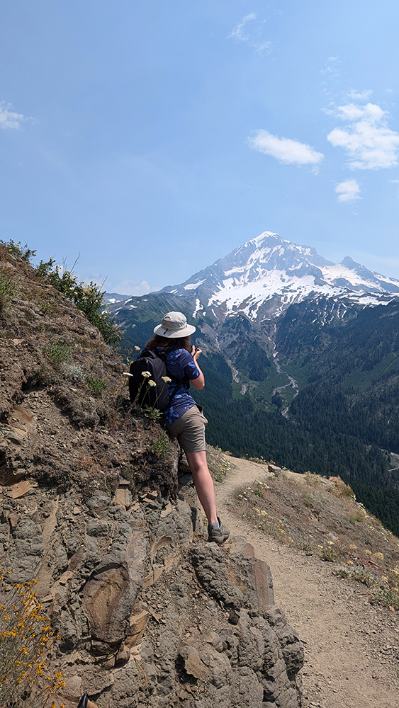 Wildflowers brushed at our ankles as we continued along the path, stopping frequently just to take it all in. Mount Hood is the highest mountain in Oregon, and is an active volcano in the Cascade Volcanic Arc. This range also includes other notable volcanoes such as Mount Rainier, Mount St. Helens, and Mount Mazama or Crater Lake. The most recent catastrophic eruption in the Cascade Volcanic Arc was when Mount St. Helens famously erupted in 1980, but Mount Hood has had volcanic activity in the last 1500 years, and still has potential to erupt again. Odds are low that it will happen within the next few decades, but scientists still monitor the mountain for signs of potential activity. For now though, Mount Hood is an outdoor enthusiast’s playground; an ideal destination for skiers, climbers, and hikers & backpackers.
