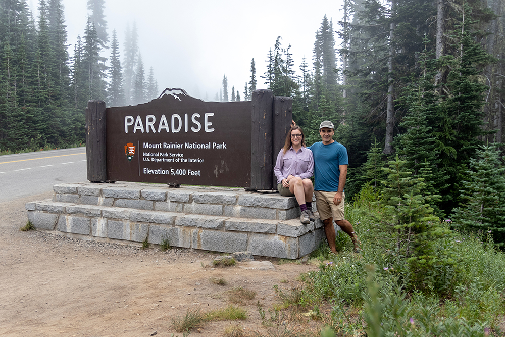 We drove up a winding road lined with tall pines trees that intermittently gave way to views of the crashing Nisqually River. Eventually we arrived at the Henry M. Jackson Visitor Center and Paradise Inn, where we searched in vain for a parking spot. Normally I like to arrive in a national park before it officially opens for the day, but we would have had to leave Portland at 4 AM if we wanted to make that happen, so now we had to deal with late morning crowds. It didn’t take long for us to give up on the parking lot, and drive down the road a ways until we found a roadside parking spot about a half mile from our trailhead.
