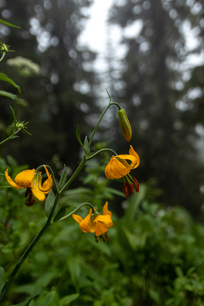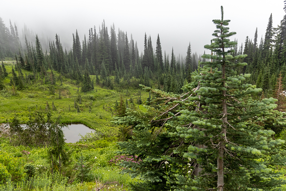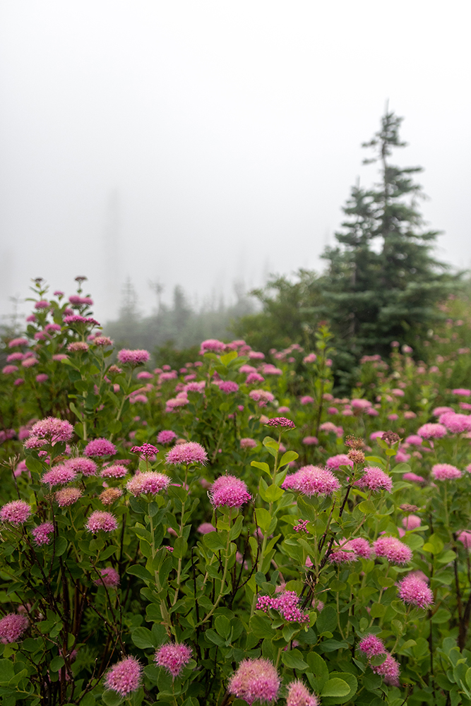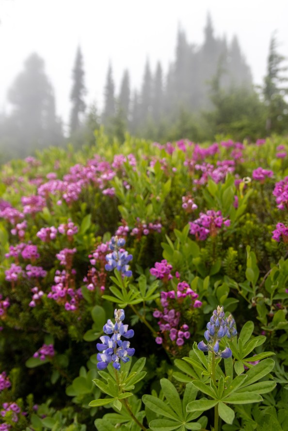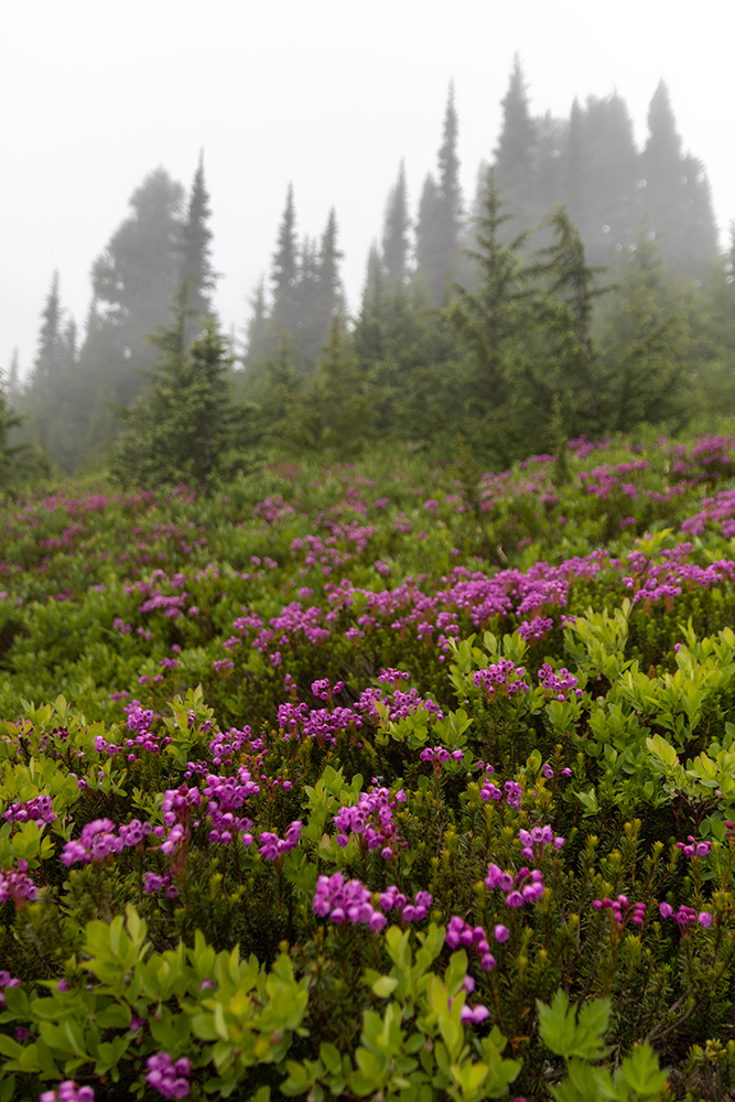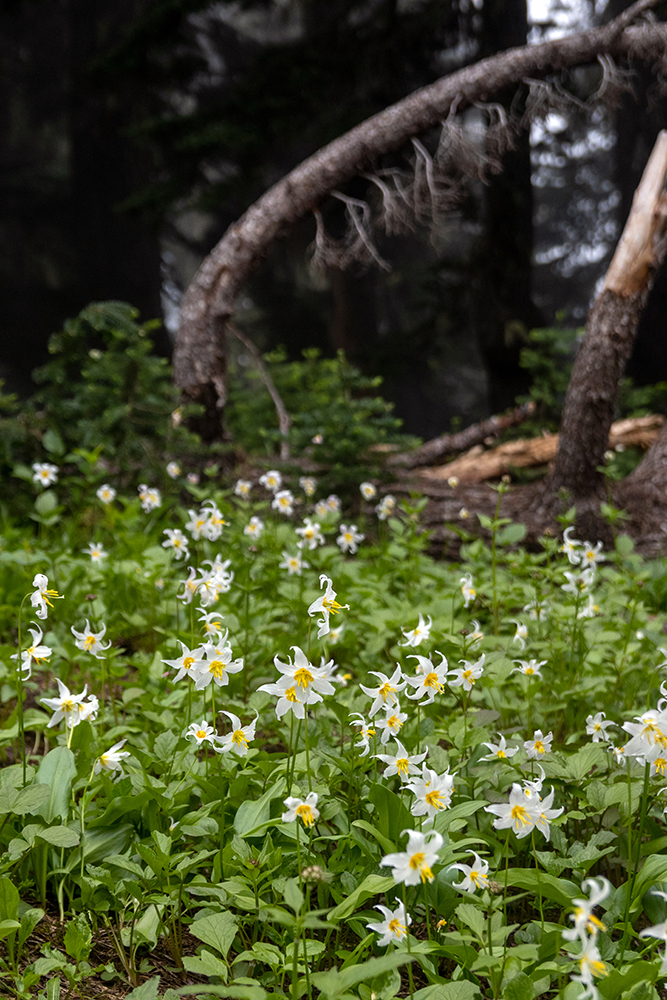 When the deer ate her way deeper into a stand of trees, we decided to keep hiking. The biggest attraction along the trail on this foggy day was by far the wildflowers. Rosy Spirea and pink mountain-heather lined the path, speckled with smaller patches of magenta and scarlet paintbrushes, tiger lily, broadleaf lupine, and bear grass. But my favorite flower was the avalanche lilies. These delicate, white flowers would blanket an entire clearing, almost giving the illusion of fresh snowfall on the meadows.