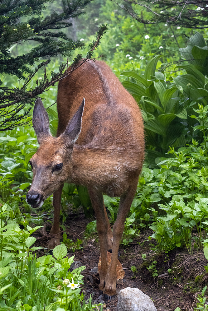 We’d only walked a few yards along the path when we encountered a black-tailed deer grazing in a field of luscious greens. Black-tailed deer are a subspecies of mule deer that range along the Pacific coast from Northern California to Southeastern Alaska. I’ve seen many mule deer during my travels in the Colorado and Wyoming, and countless white-tailed deer over a lifetime of living in Michigan, but for some reason I was still excited to see by first black-tailed deer. It looked very similar to the deer I see almost every day on my morning commute, but its tail was black instead of brown, and much less fluffy than a white-tail’s. We watched the deer grazing for an inordinate amount of time. After all, it’s not like we had any spectacular mountain vistas to rush off to see.