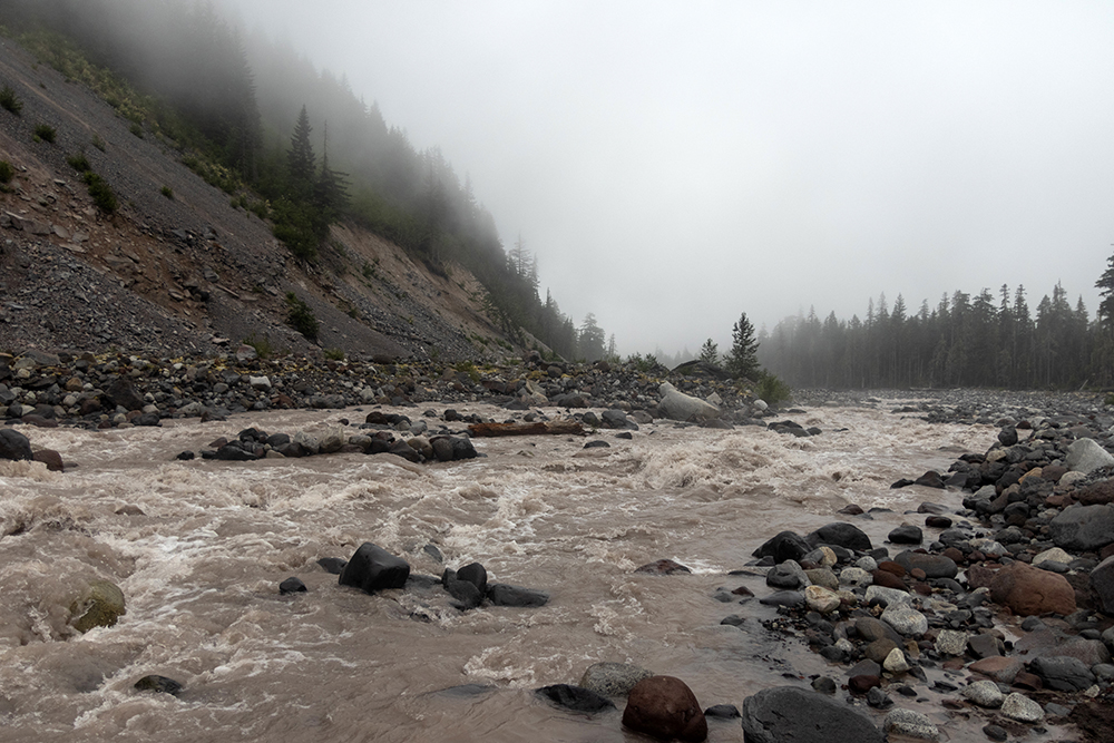 After Christine Falls, we made one last little detour to the bank of the Nisqually River. Here, we walked across a landscape of gray stones, that led us to the edge of a gray river. One the other side was the base of a gray hill, that dissolved into a thick shroud of gray fog. If it weren’t for the occasional reddish brown rock here and there, I would have thought we’d stepped into a black and white photograph.