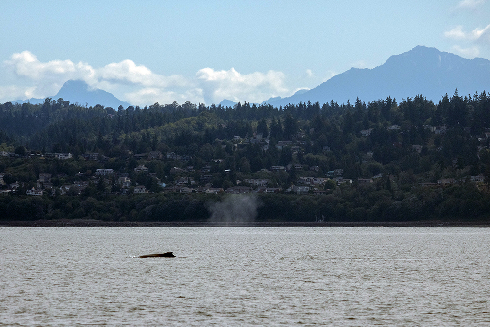 The four of us had elected to buy souvenir bottomless coffee mugs from the Swiftsure’s cafeteria, and we sipped coffee, tea, & hot cocoa, and tried some fresh-baked blueberry buckle cake as we scanned the horizon for any signs of blow spouts. Much like hiking in the mountains, whale watching is an activity that is highly dependent upon luck, and apparently the luck that had missed on Mount Rainier, was saving itself for our day on Puget Sound.