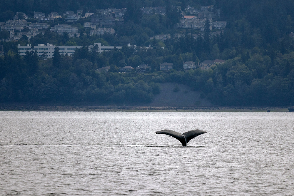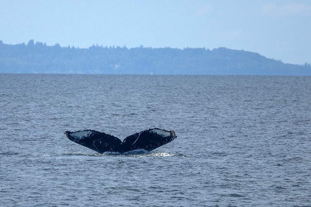 After arriving in Edmonds, we joined a line of other passengers who were waiting to board Puget Sound Express’s newest vessel, the Swiftsure. The line filed past a marina filled with sailboats, and we looked for crabs and jellyfish in the water under the docks as we waited. Once we were boarded, the catamaran’s on-board naturalist explained how to spot the different whale species that live in the area as our captain steered the boat out of the marina and onto the sound.