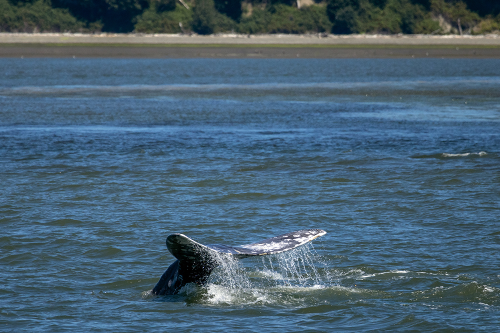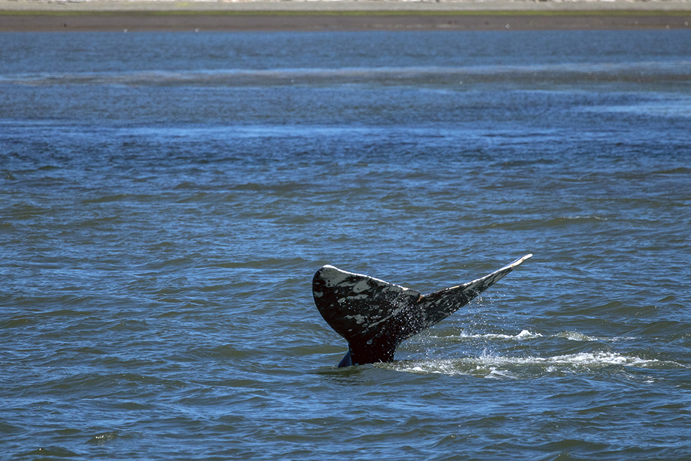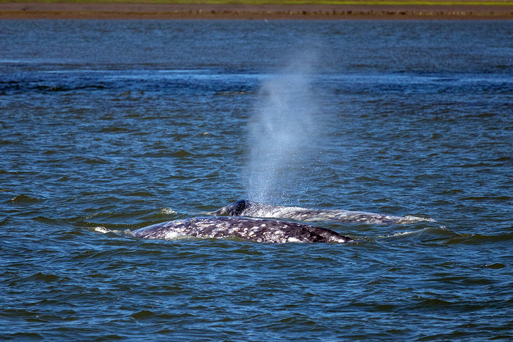 At this point our tour could have ended and I would have been ecstatic to have seen two major cetacean species in one day, but our captain announced that we would be moving on, and we were going to try to get a third species in before returning to port. So I retreated inside to wait out the windy ride until we arrived at a river delta where gray whales are known to feed. More jagged mountains loomed on the horizon as we scanned the water for any signs of whales.