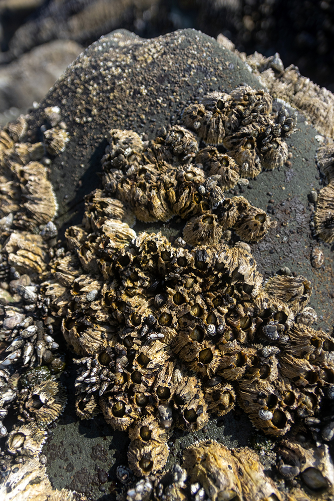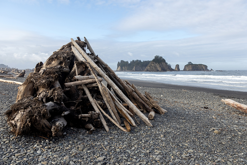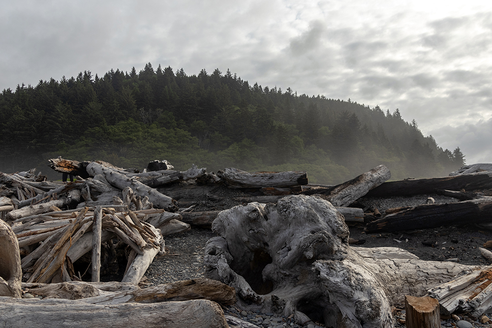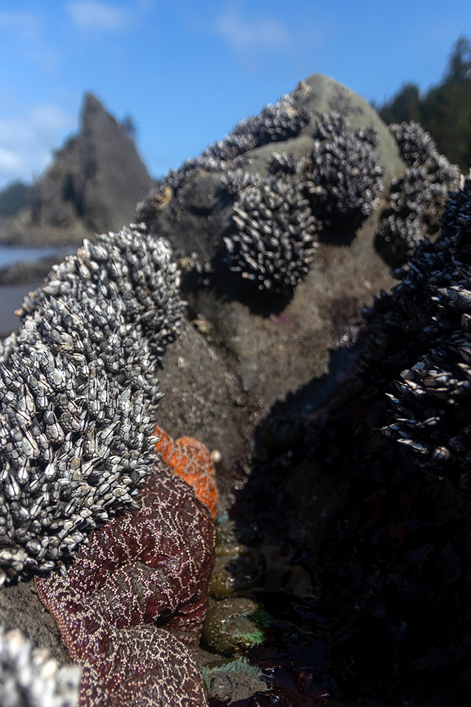 The morning air was still cool when we stepped foot on the wild shore of the Pacific. Low tide was about an hour away, plenty of time to walk a couple miles down the beach to where we knew that rocky tide pools were likely already emerging from beneath the receding waves. Instead of sand, Rialto Beach was covered in gray stones that had been washed smooth by the forces of the tides. Skeletal, bleached trunks of trees that had once stood tall and proud in the surrounding forest now littered the shore. There were driftwood forts built up amongst the rubble, although all it would take would be one rogue wave, and the structures would rejoin the incongruous piles of wooden bones.