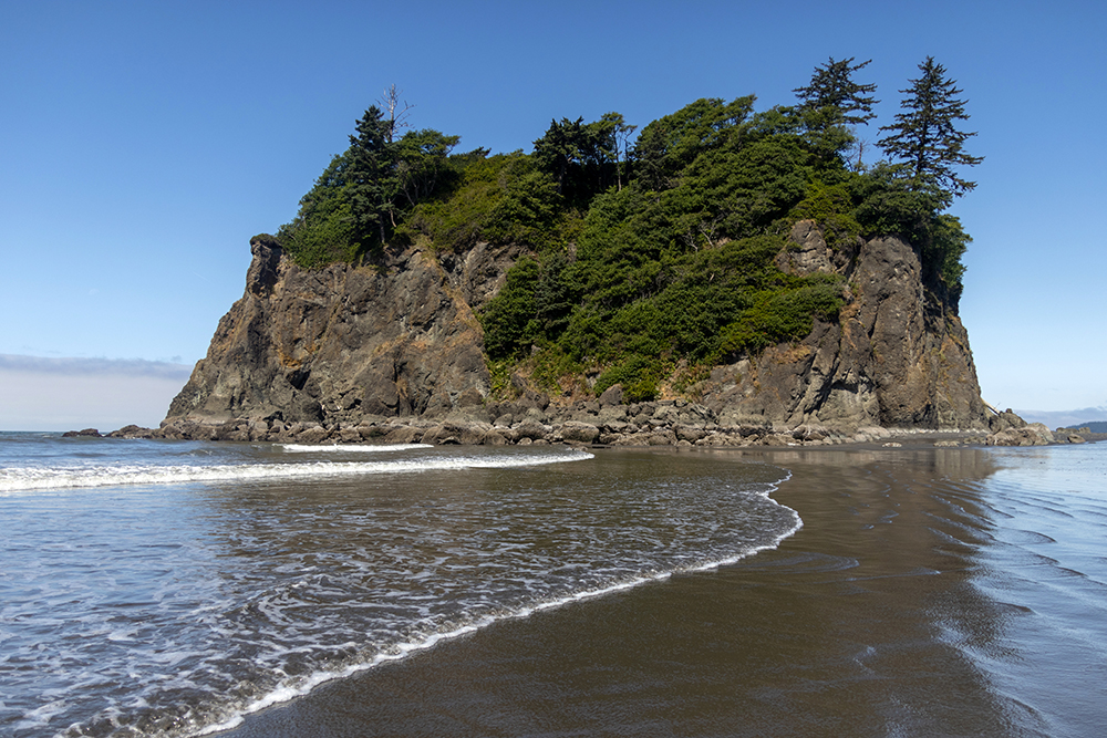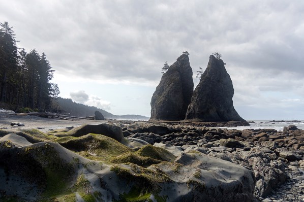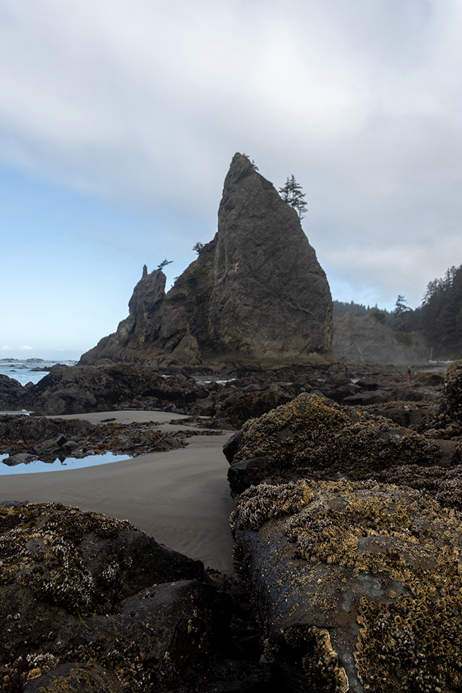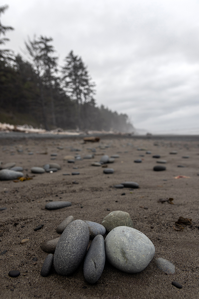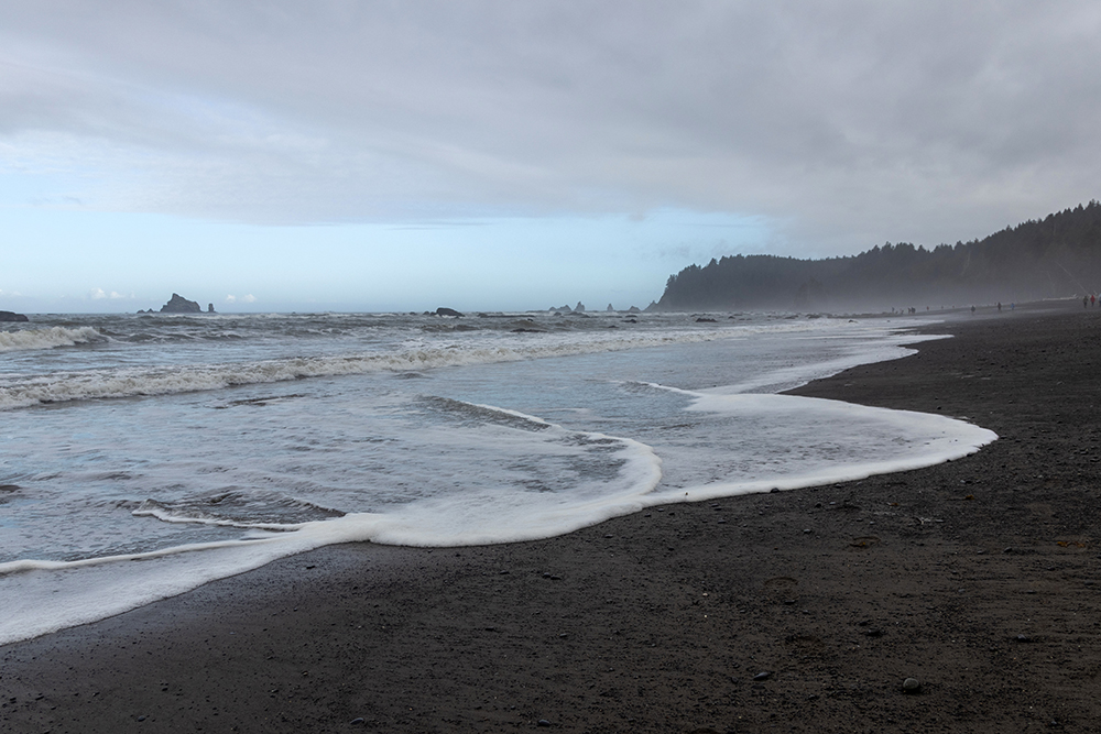 Vince and I started walking northward along the shore, balancing on top of long logs whenever we wanted a break from stepping on the rocky earth. Eventually the rocks gave way to pebbles, then the pebbles to coarse sand. The driftwood also became more sparse. We’d left the immediate area of the Quillayute River, which is largely responsible for the the tree graveyard near its mouth. Frothy waves licked at the shore, leaving white lines of foam behind as they receded back into the ocean. The landscape was made of shades of gray as though the color had been leeched from it. It was stark and lovely, but up ahead, the silhouettes of sea stacks loomed above the sand, reminding me that the best was yet to come.
