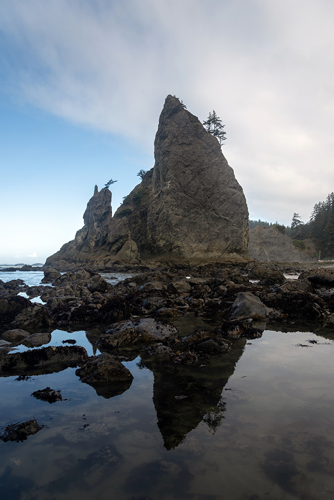 After two miles that felt more like four-sand is always frustratingly awkward to walk on-we arrived at the base of a set of twin sea stacks that rose up from the ocean and pointed toward the sky. The glass-thin waters of the receding tide were a perfect mirror to reflect an image of the two pillars onto the beach. We’d finally arrived at a good spot to start tide pooling, but I was too engrossed by the dramatic landscape to start searching the rocky pools that had formed in the tide’s absence.