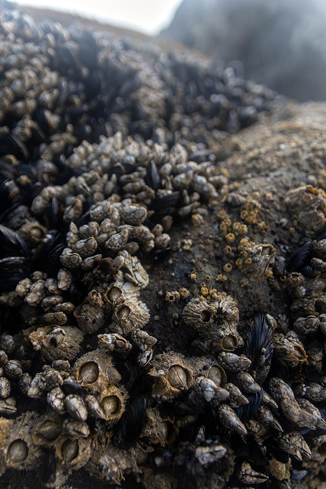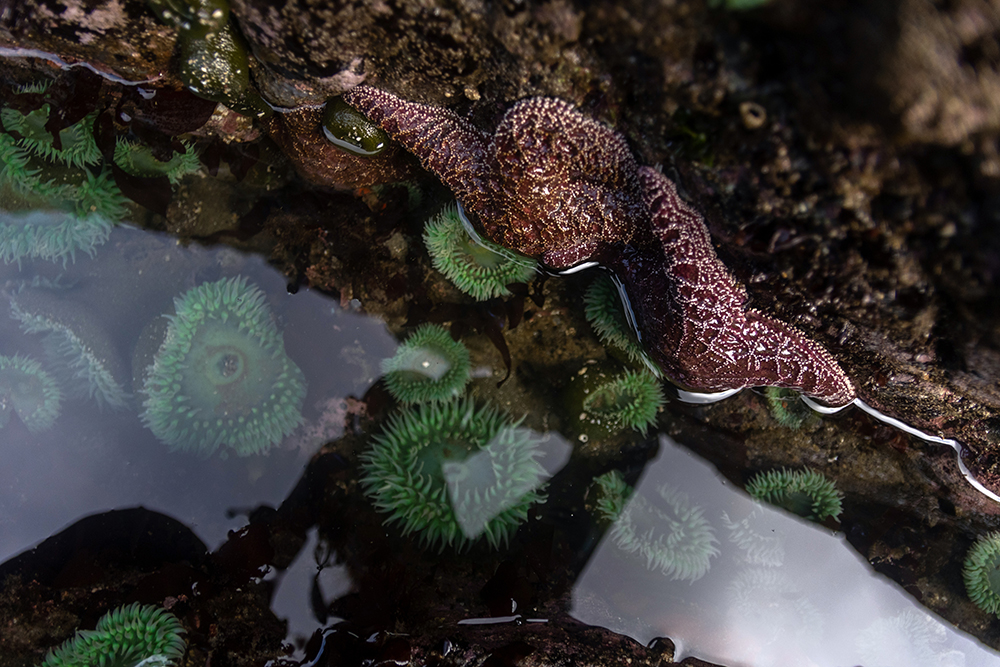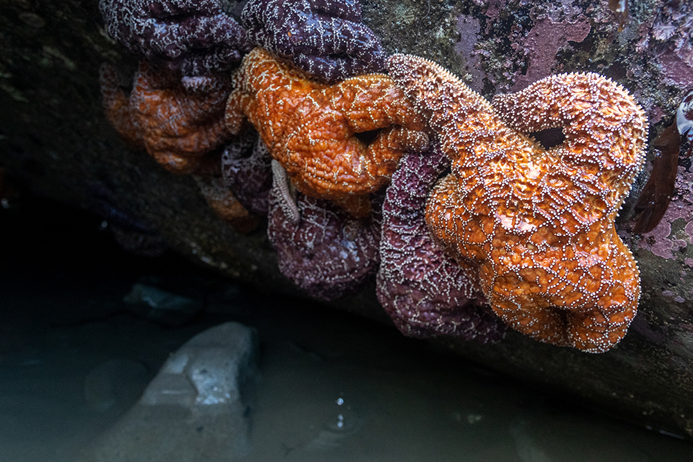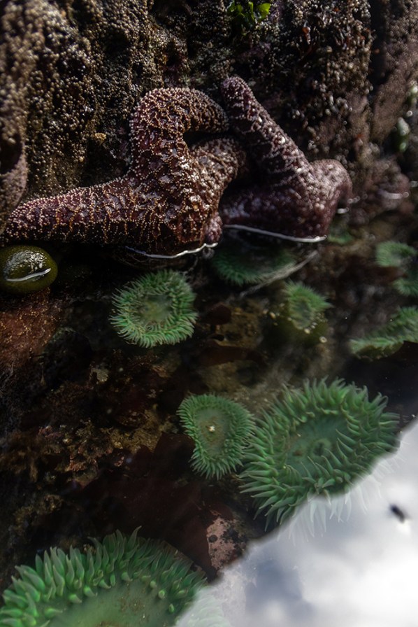 Vince on the other hand, starting poking around the pools immediately, apparently unimpressed with the sea stacks. He disappeared behind a large boulder, while I admired the scenery, hopping across slippery rocks to find a better vantage point. As I knelt down to get an angle I wanted for a photograph, I serendipitously encountered my first tide pool creatures. Underneath a large boulder clung a cluster of ochre sea stars in shades of purple and orange.