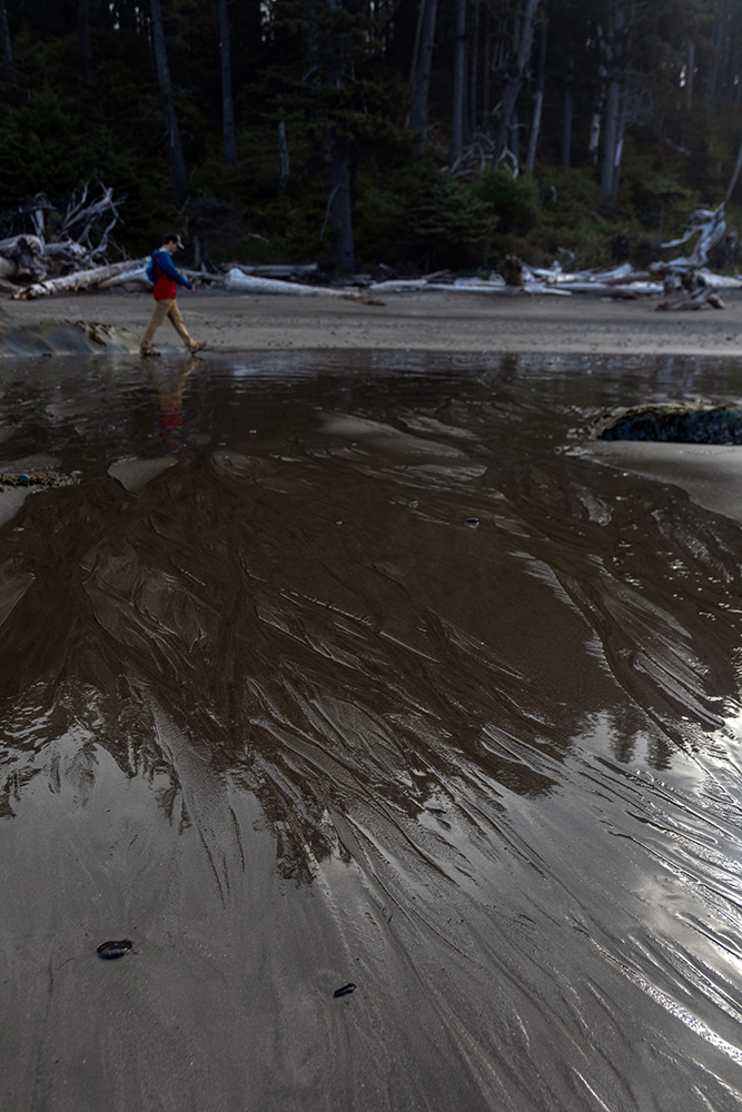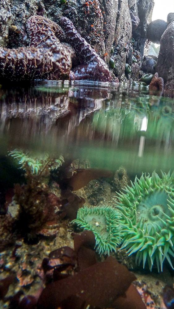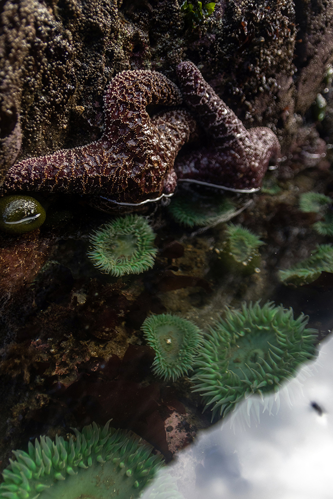 A short, windswept trail led us down to the beach, where we joined a veritable crowd of other tide-poolers and beachgoers. We followed cedar creek passed piles of driftwood and out to another mirror-like tidal flat. We walked across the sand until we reached a massive sea stack, and then spent a few minutes looking for more sea stars and anemones at its base.