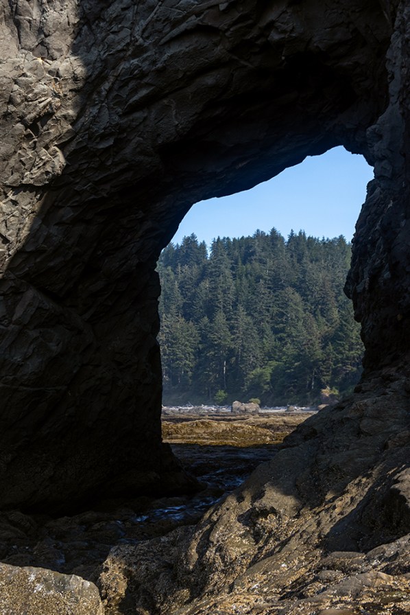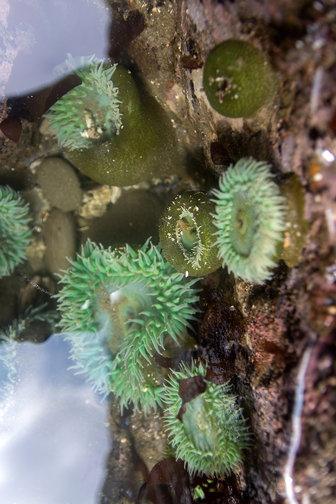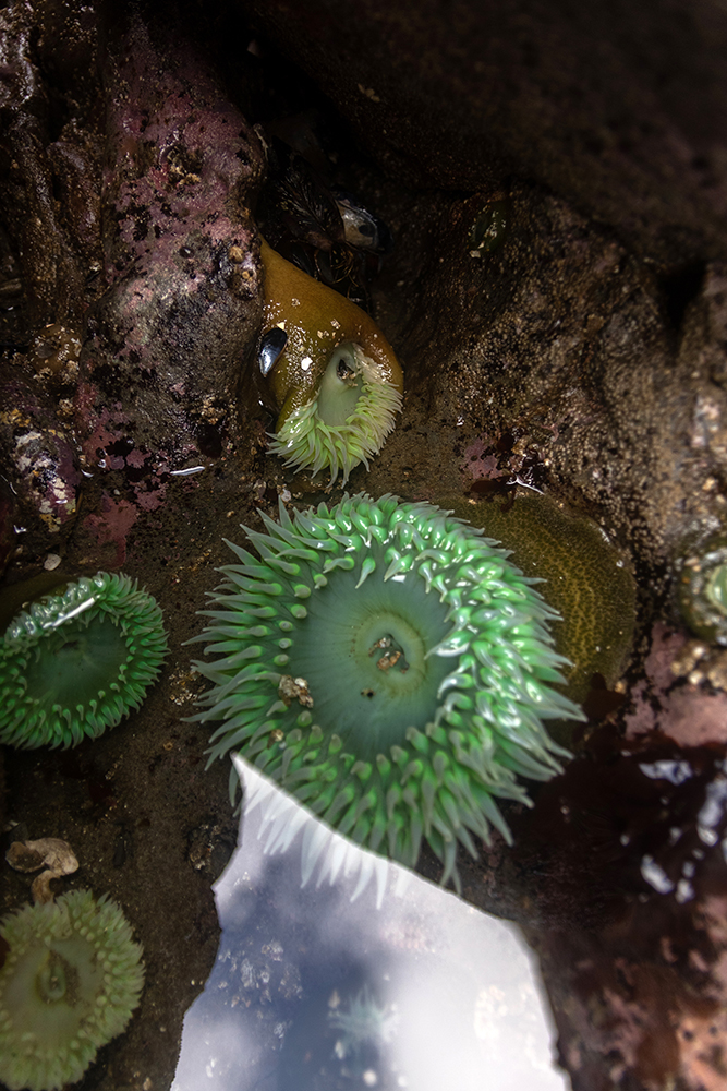 I managed to wave Vince over to show him my find before we continued hopping across rocks together. Up ahead of us was Hole-in-the-Wall, which is a geological feature that is exactly what its name would suggest, a hole in the middle of a large sea cliff that protrudes into the ocean. At high tide, Hole-in-the-Wall is inaccessible, but at low tide, you can walk right through it, and we were planning to do just that. We kept an eye out for more critters as we picked our way over the rocky shore to Hole-in-the-Wall. Through its opening, we could see more tide pools in front of an evergreen forest on the other side. As we passed underneath, I found my first giant green anemone of the day in a shallow pool.