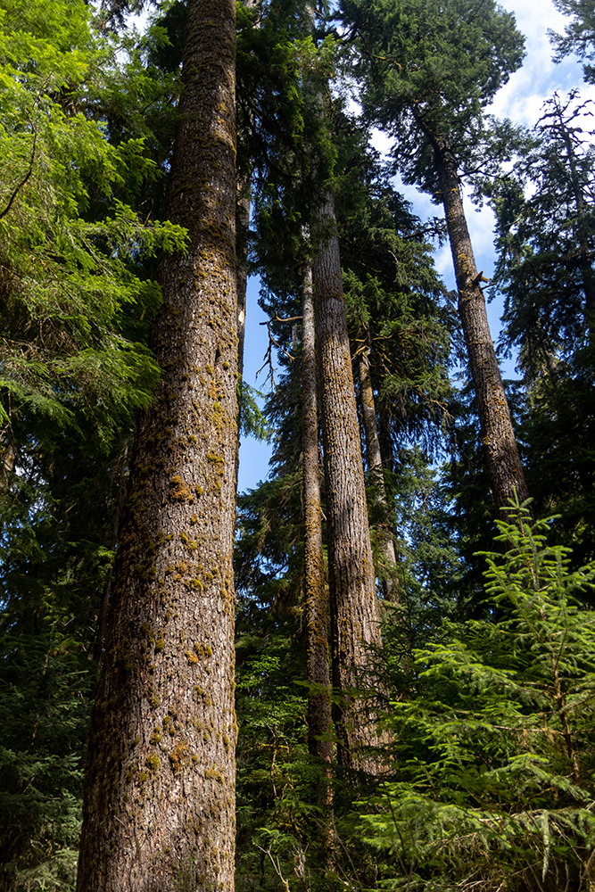 Along the trail, we learned about nurse logs. These form when tree seeds germinate on a fallen log instead of on the ground. As the new trees grow, their roots start to encase the dead tree. The dead tree continues to rot, eventually leaving the younger trees lined up in a row with their roots intertwined. We found a stand of trees that had grown on a nurse log, and were now connected by a network of above-ground roots that gleamed in the late afternoon sun.