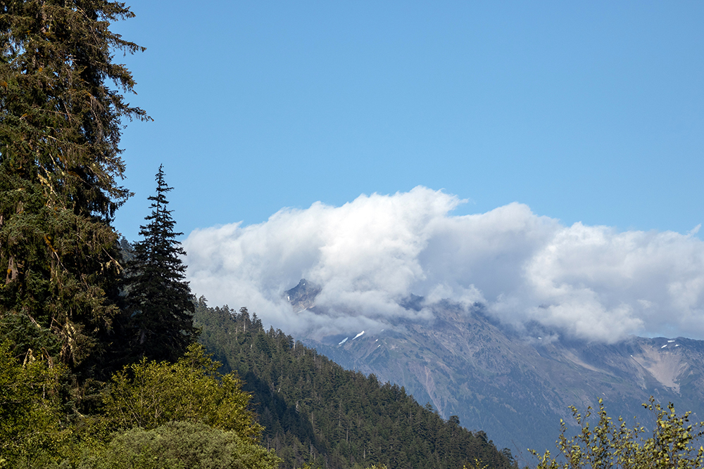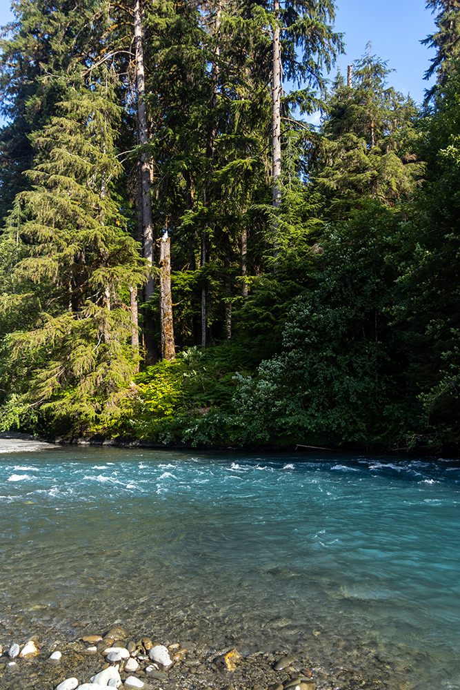 There was only one trail left to go when we met back up at the start of the loop. The Hoh River Trail is 18 and half miles long in one direction, so we knew there was no way we’d get to walk the whole thing. We’d just hike until we reached the river and turn back around. The first river access was about a mile from the trailhead, so we passed through more ferny forest until we finally found an opening to step out onto the rocky bank of the Hoh River. The clearing the river provided gave us a clear view of the distant Olympic Mountain Range, which lay beyond the cold, aqua waters of the river.