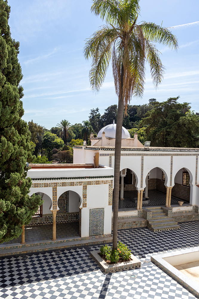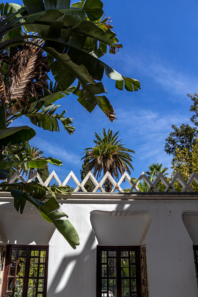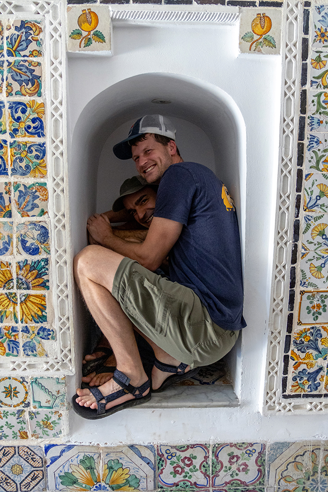 There was a shop selling different kinds of flatbread nearby, and we tried a variety of different flavors of mahdjouba, or flatbreads stuffed with different ingredients. One of them tasted like pepperoni pizza, while another was stuffed with melted cheese, and another with onions. We snacked on the breads as we made our way over to another palace, where we ducked inside to see its lavish courtyard, which was decorated with hexagonal floor tiles, and twisting plaster columns. In the center of the courtyard was a fountain which housed lush greenery and a few colorful fish.