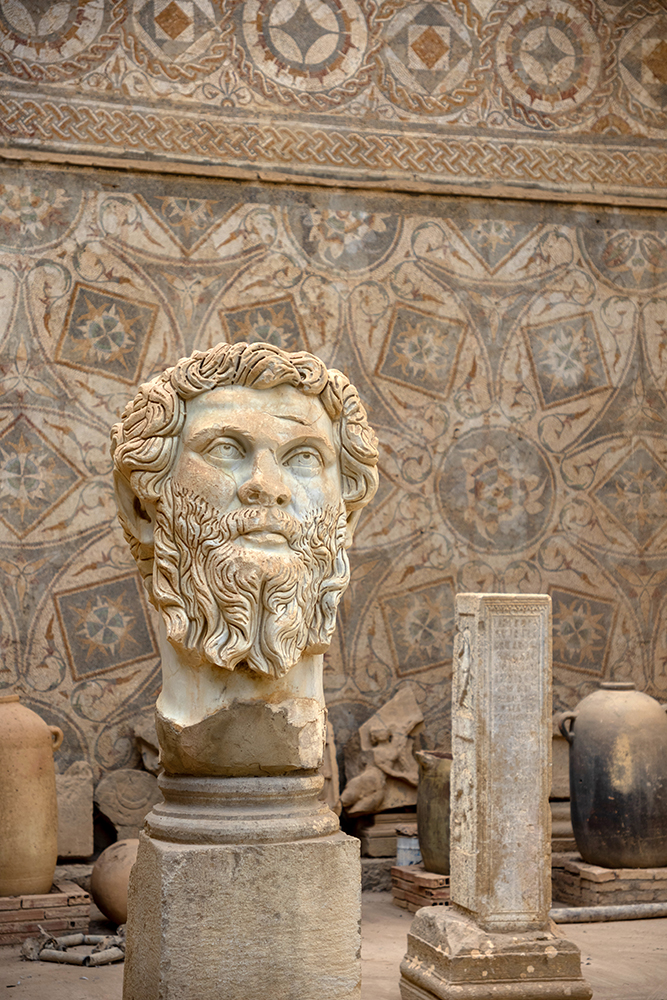 We walked in slow a circle around the tomb and then we were on our way, our next stop being Timgad. We arrived at the site within a couple more hours. As was becoming routine, we ducked into the site museum immediately after passing through the entrance gate. This museum was full of mosaics and household objects that had been recovered from the city of Colonia Marciana Ulpia Traiana Thamugadi, which was founded sometime around 100 AD by Emperor Trajan. It was originally used as a military colony and occupied mostly by Roman veterans and colonists, and much of their pottery and coins were displayed in cases in front of the mosaics removed from the city’s floors.