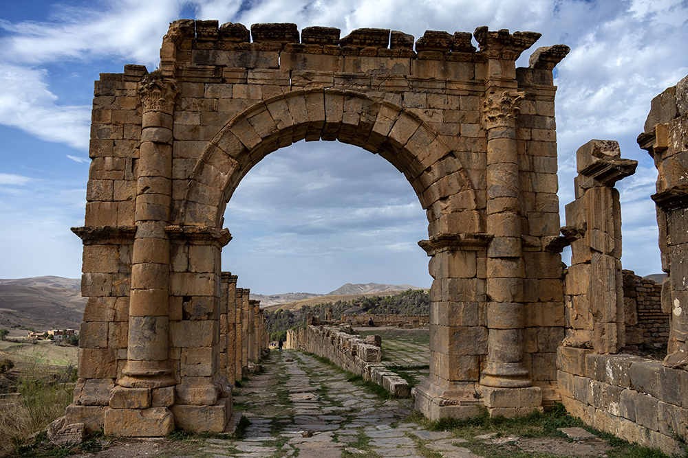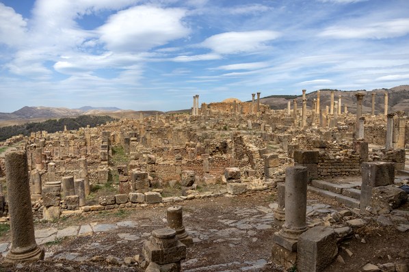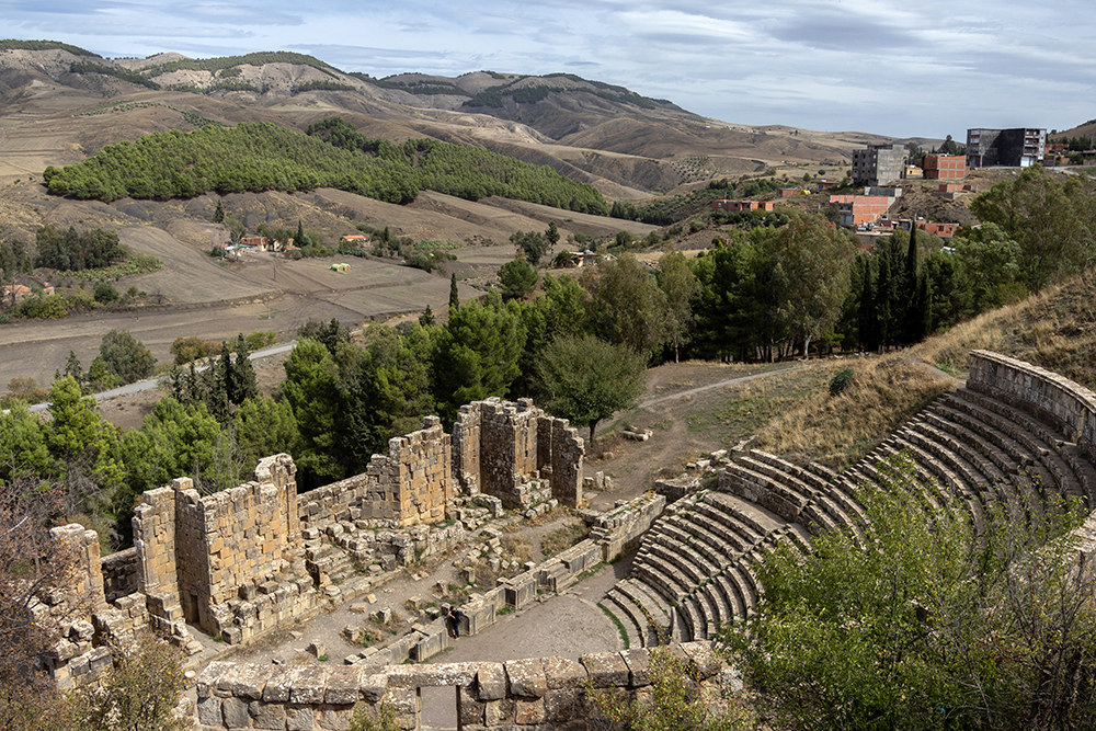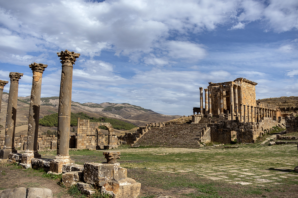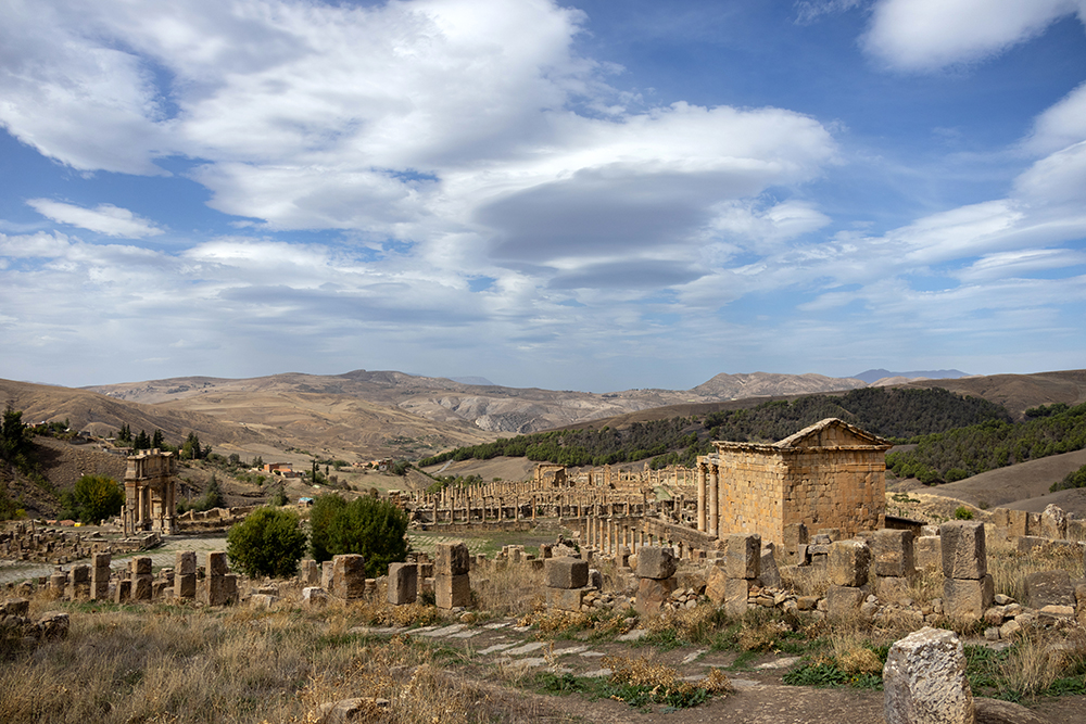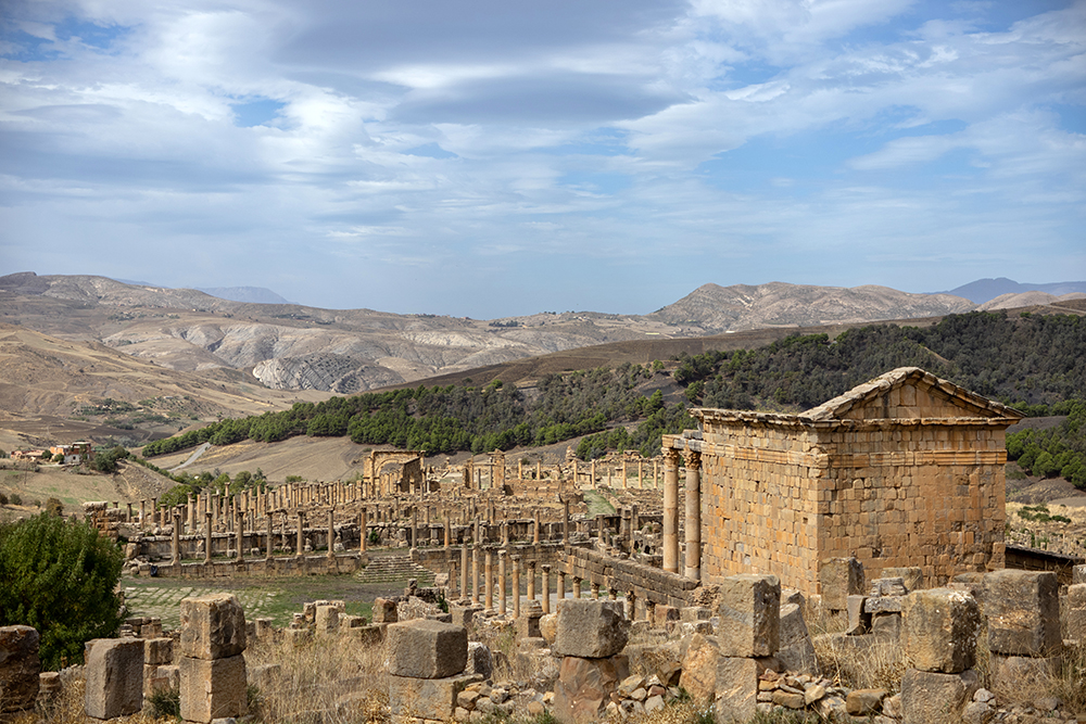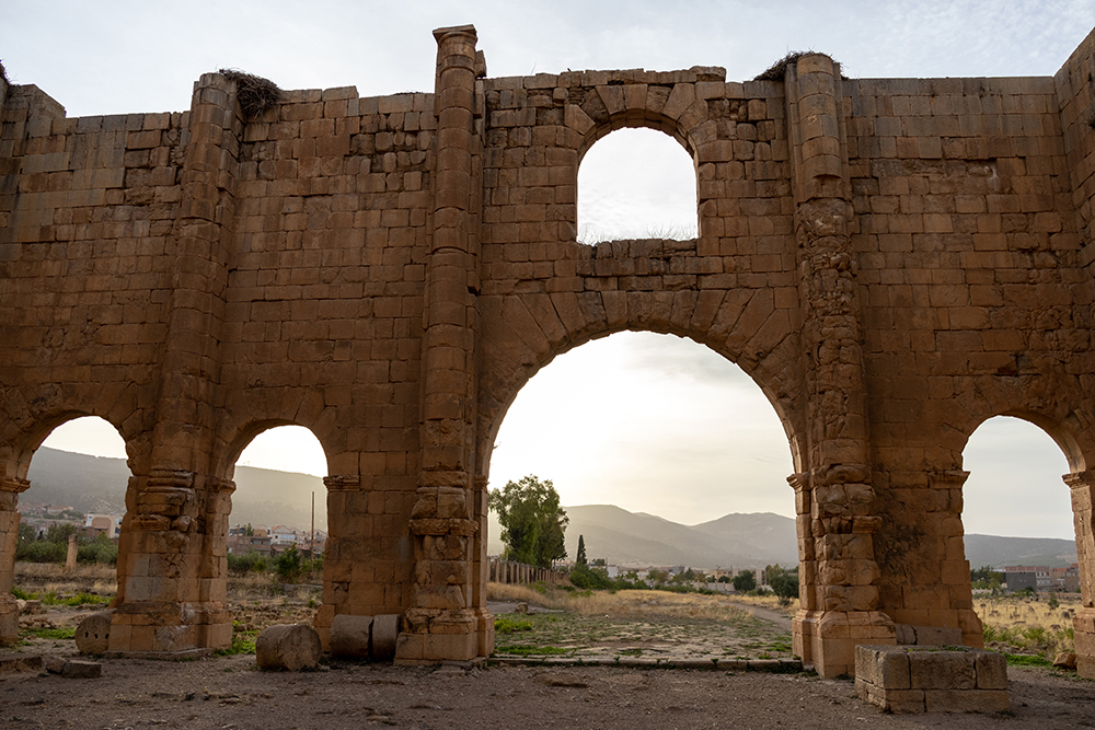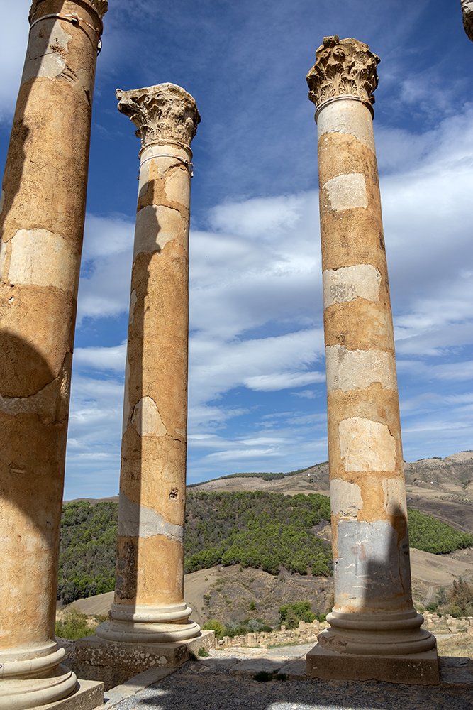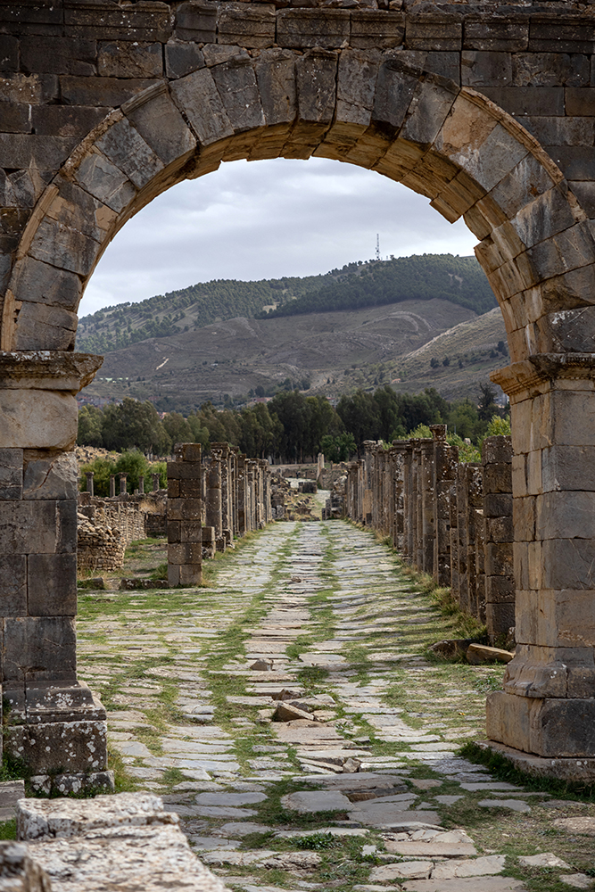 Once we’d walked through each room of the gallery, we followed the guide outside where we stopped for a moment to take in a view of the city before walking between two perfectly aligned rows of trees towards the crumbled remains. The museum had been fantastic, but even so, it couldn’t compare to the sight of the sprawling ruins that stood in defiance of the surrounding mountains. The city, originally named Cuicul, was built in the 1st Century AD. Today it is known by the very fitting name, Djémila, which is Arabic for beautiful.