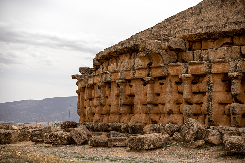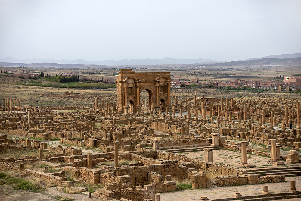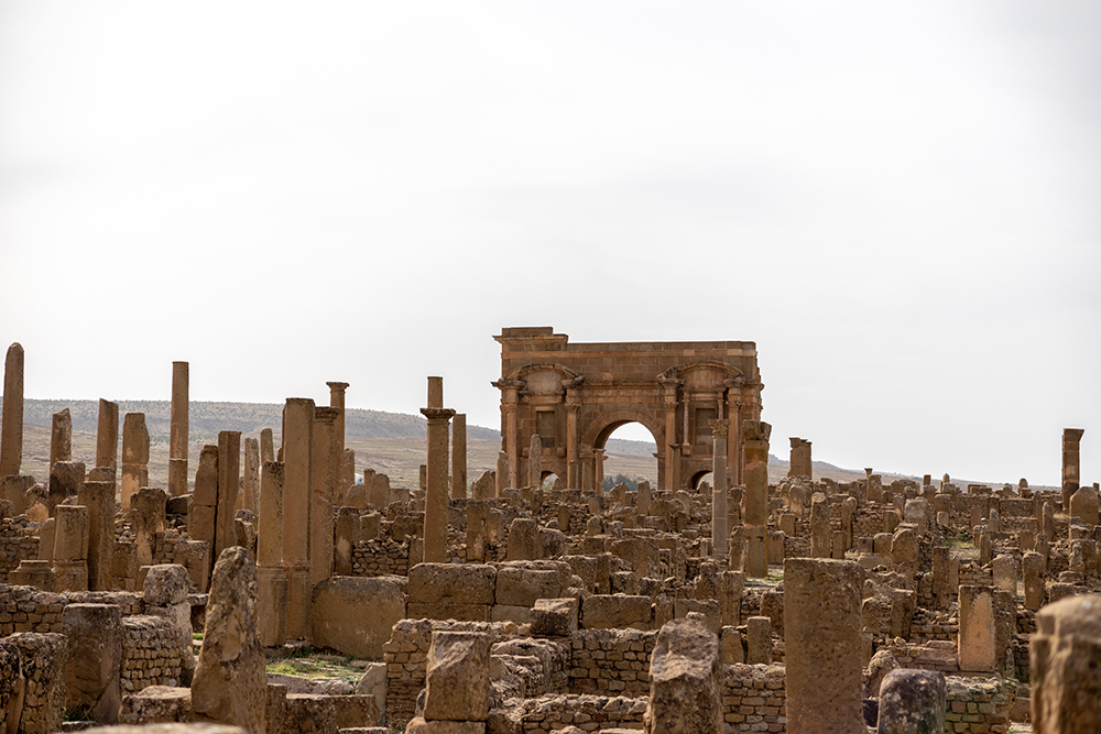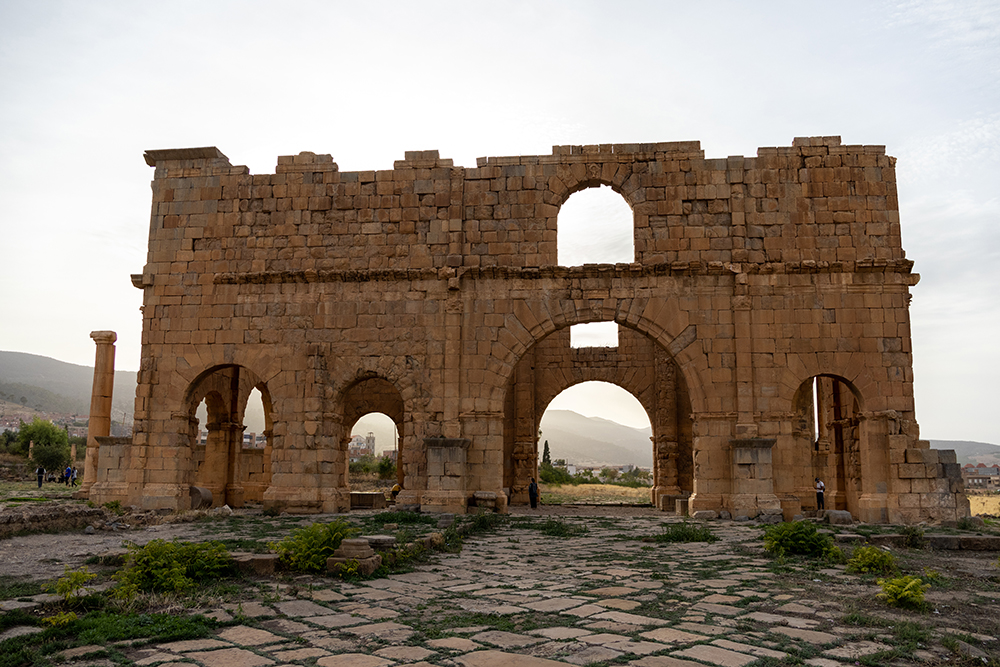 The next morning we were back in the van, traveling to yet another ancient Roman ruin called Timgad. Along the way, we made a quick stop at Medghacen, an ancient Numidian mausoleum that was built in the 3rd Century BC. It’s domed, circular structure was similar to that of the Royal Mausoleum of Mauretania, a site we’d visited a couple of days earlier. But Medghacen is a few hundred years older than the Mausoleum of Mauretania. It’s an excellent example of how different cultures in the area informed each other’s building techniques. The columns of the tomb seemed influenced by Greek architecture, while its stepped dome was similar to the pyramids of ancient Egypt.