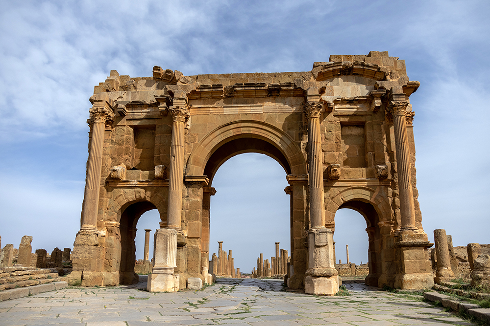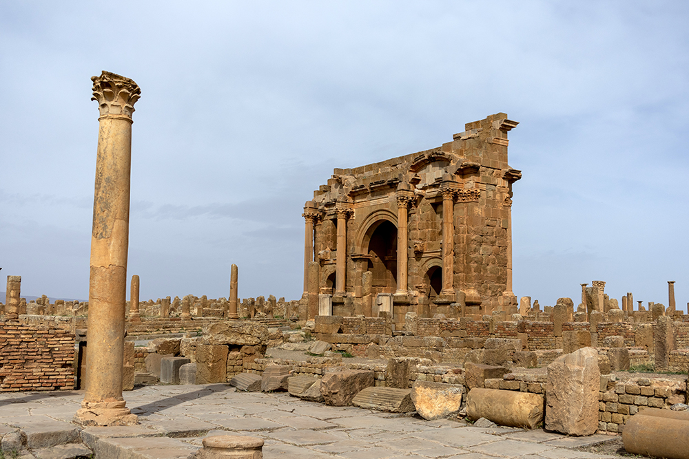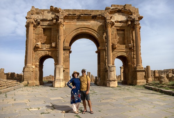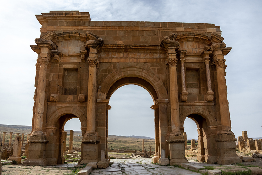 Reluctant to leave the view behind, we descended back to the ground where we followed our guide to what is possibly the most distinctive feature of Timgad, Trajan’s Arch. This arch had three seperate gateways, a large one in the middle for carriages to pass through, and a smaller one on each side for foot traffic. This was a really beautiful piece of architecture, and a wonderful spot to get some photos. Once again, we had the ancient city mostly to ourselves, so we didn’t even have to queue up to have our pictures taken.