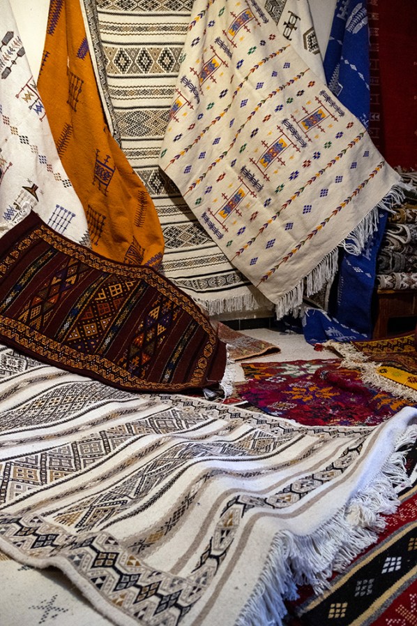 We entered a nearby store, ducking underneath some hanging carpets, and the shopkeeper, led us up to the second floor where hundreds of hand woven rugs were folded in stacks on the floor, and draped from the walls. The sheer variety of colors and patterns was overwhelming, and I struggled to pick a favorite as the shopkeeper explained the meaning behind some of the Berber patterns. Just like our guide had told us, there was no pressure for us to make a purchase. The shopkeeper allowed us to take pictures, and wasn’t offended when we said we would look around at the other stalls before making any decisions.