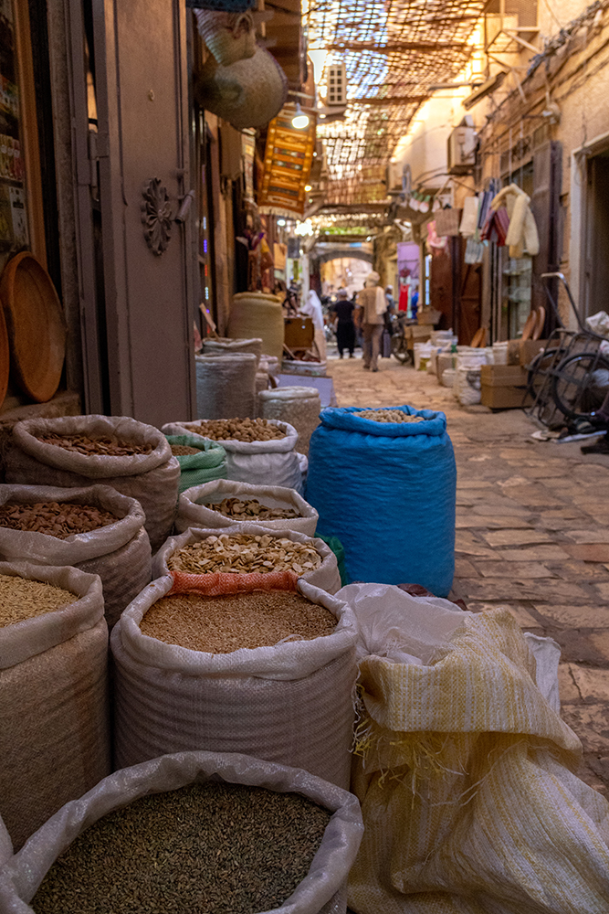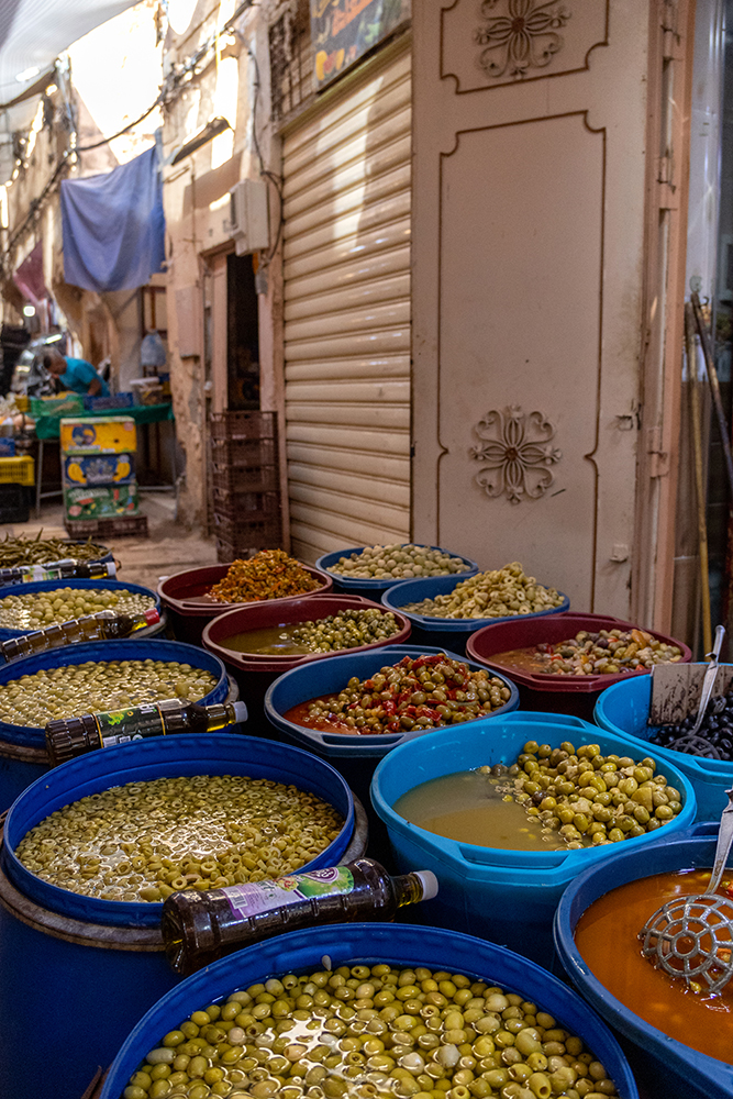 Our guide led us into a couple of tight stores to show us the back room of a very old pharmacy, and a shop full of antique items. Motorcycles puttered along the narrow street every so often, and we moved out of their way as they passed. We talked to a meat seller, who had the severed head of a camel behind his counter, and then sampled some local olive oil. Bins of herbs and olives lined the sides of the streets, creating endless interesting angles for photography.