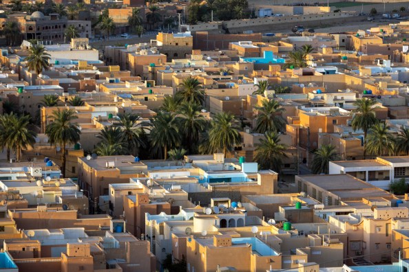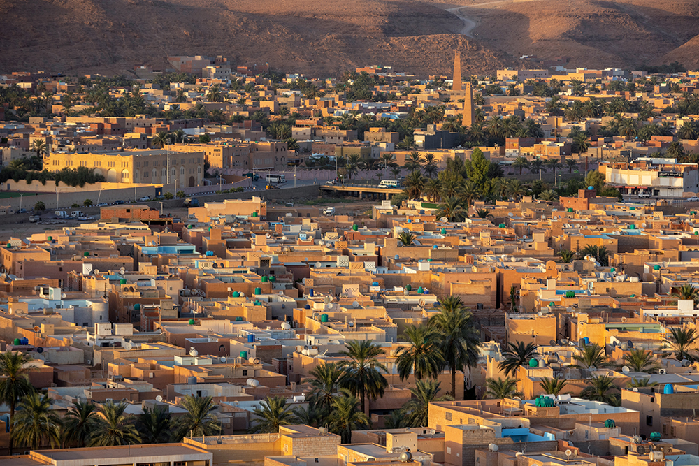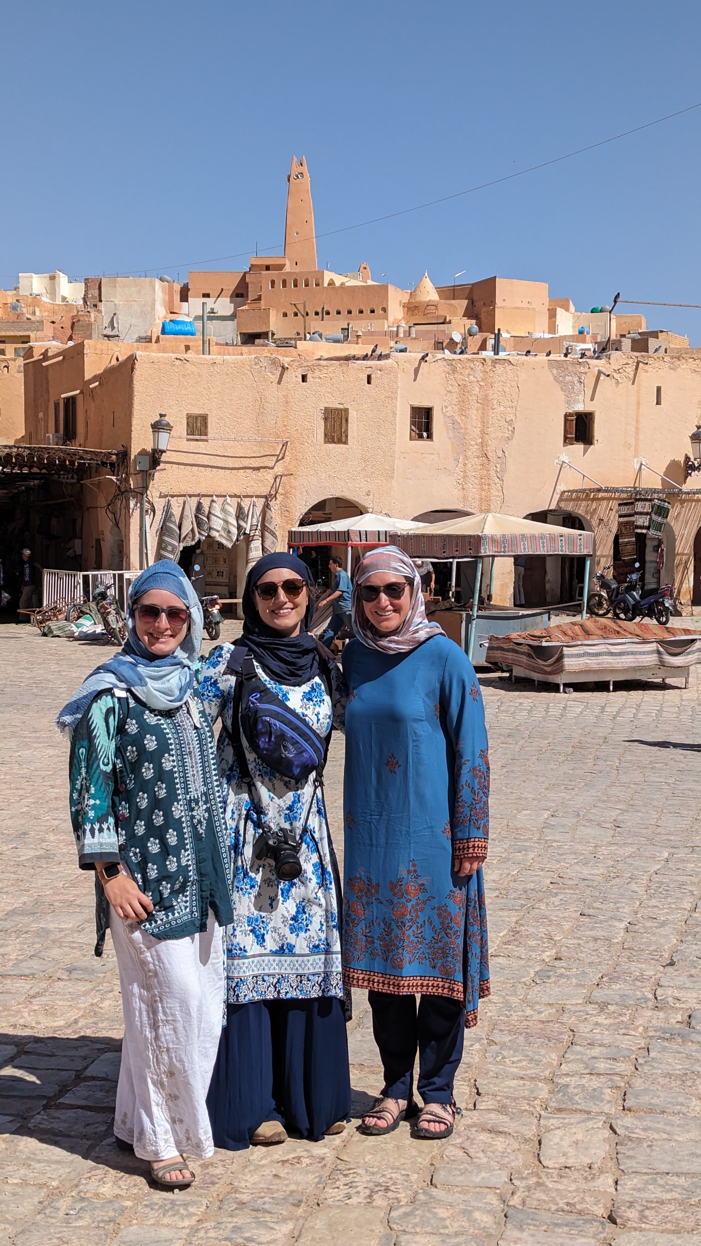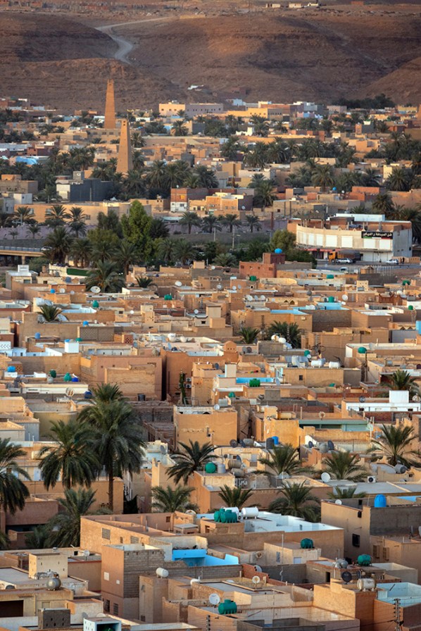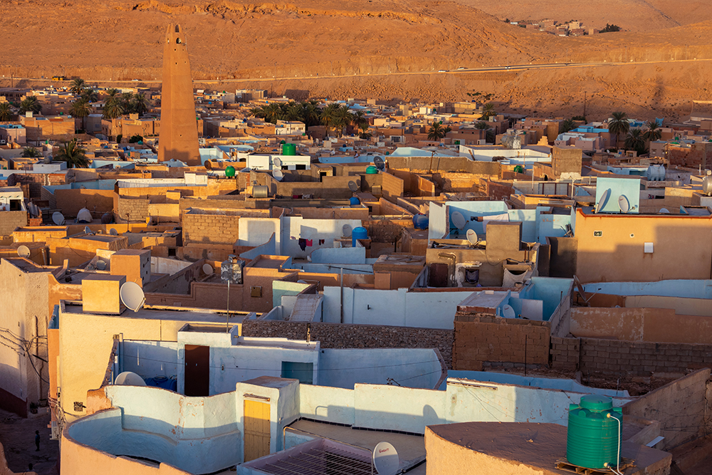 A city of rectangular buildings in various sandy shades covered a distant hillside as my friends and I absorbed the landscape with blinking eyes in the early morning light. The sea of tan was broken only by swatches of light blue paint and aqua water tanks. Beyond the hill, the city melted into an endless backdrop of rolling waves of sand. We’d arrived in the Saharan city of Ghardaïa, Algeria late the previous night, then got up early to start exploring, stopping first at this roadside vantage point that overlooked part of the sprawling city. This would be the southernmost point on our nine day tour of this fascinating country, and we only had one day to see as much of it as possible.