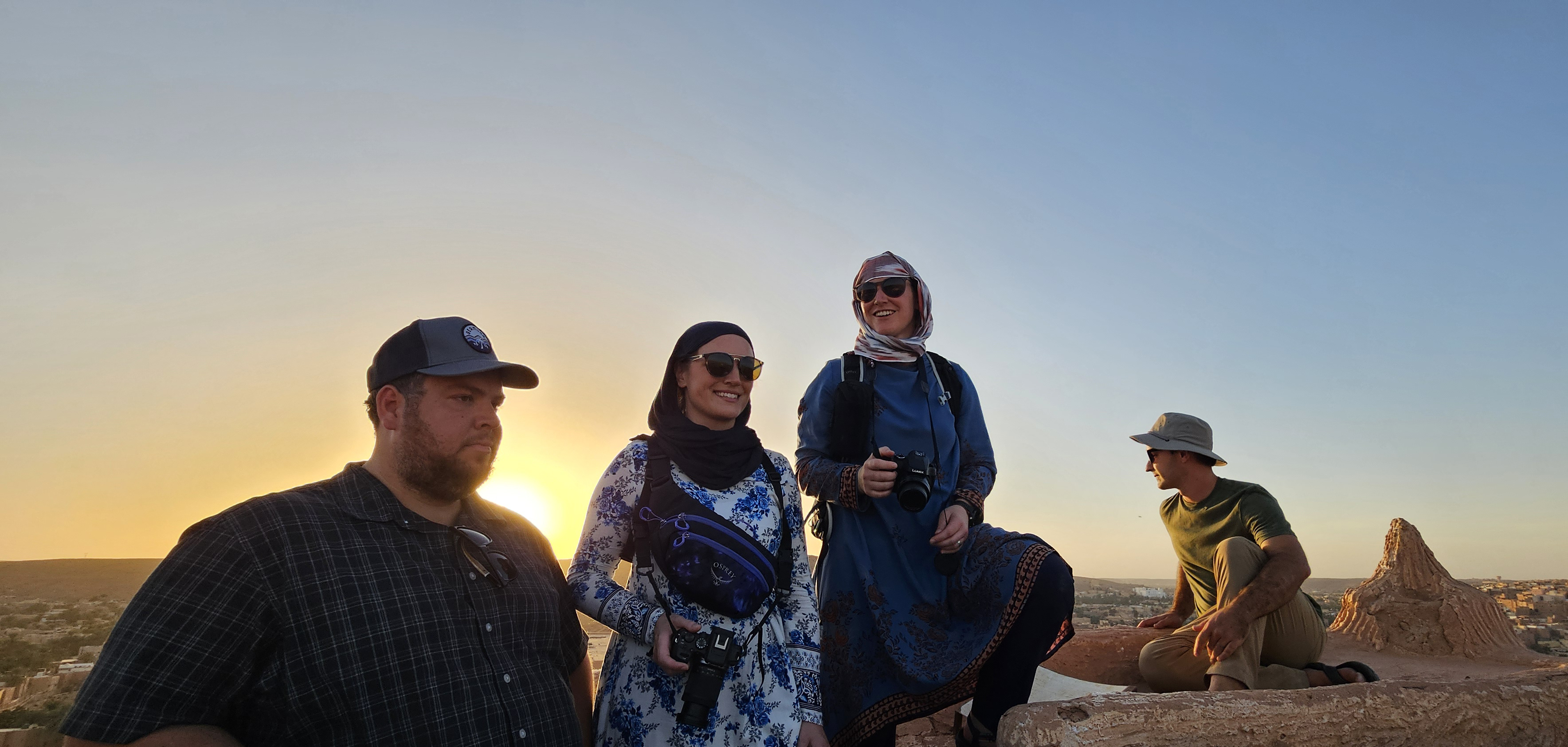 Just before sunset, we arrived at a tower on one of outer walls of Beni Isguen. We climbed up its winding staircase and emerged onto the top to find a breathtaking view of the village, illuminated in golden light. The sun sank behind a nearby mountain as we gazed over the view of square buildings with date palms growing between them.