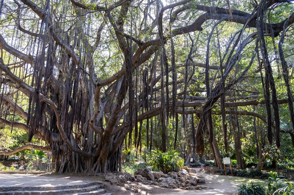 We continued down a series of avenues that were each lined by a specific type of tree. One trail was lined with bamboo, and another figs. Climbing over a tangle of large buttress roots, we came upon a monstrous banyan tree with vines hanging down from its web of twisting branches. Known as the Tarzan Tree, this is one of the oldest trees in the Garden of Hamma. It also has an interesting history. The Tarzan Tree was used as a set in the 1932 film Tarzan the Ape Man. This was one of the highlights of our visit to the botanical garden, and we took some time to walk underneath it, staring up at its wild branches as warm sunlight filtered through them.
