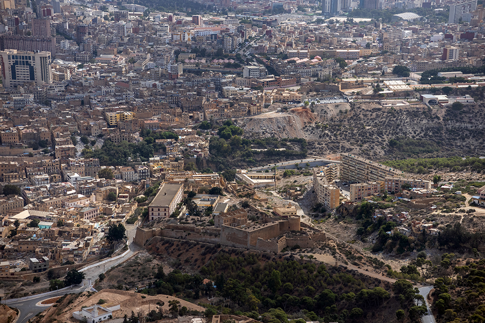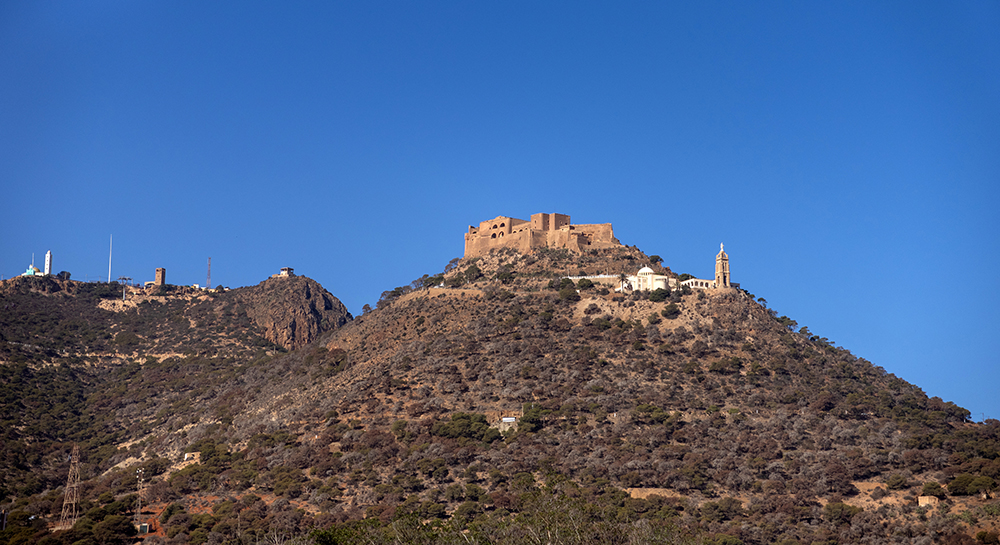 After a quick stop to view the exterior of the former synagogue, we continued our walk until we reached a tall, stone wall. Stepping through a gateway in the fortification, we left the city streets behind and emerged onto a dusty hilltop. To our west we could see a distant fort built on the top of an even taller mountain. I recognized the structure immediately as the Fort of Santa Cruz. It’s one of the most iconic points of interest in Oran, and we would get to visit it later on in our tour.