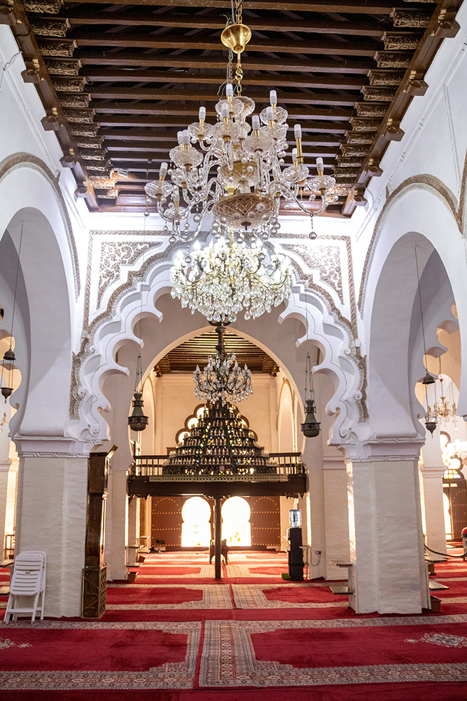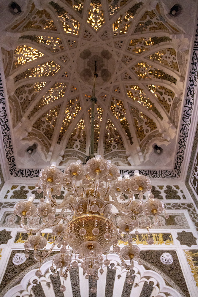 Once the three of us had our scarves on, we all took off our shoes and entered the mosque. We got the chance to admire its detailed architecture, complete with resplendent chandeliers, and to get a better look at its tall minaret.