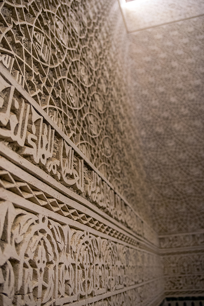 As we all quietly discussed how strange the skies looked, a palace site guide approached and introduced herself. She was extremely friendly and knowledgable, and we were all excited to start the tour. We followed her back along the wall, and then into the palace itself where she explained the site’s history as we moved from room to room, gawking at the 12th century Moorish architecture. My favorite features of El Mechouar Palace were its courtyard lined with carved plaster arches, and the heavily decorative plaster carvings inside its many chambers.