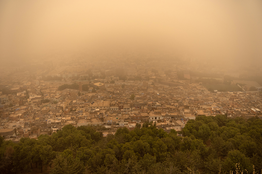 Dust was everywhere at this point. I could feel it coating my teeth and sticking to the back of my throat. I had to blink fine granules of it out of my eyes, and wipe off my camera’s lens every few seconds. Ostensibly, we should have been able to see a sprawling view of Tlemcen, bordered by neighboring mountains. In reality, all we could see were a smattering of buildings at the foot of the plateau. The shapes of the city faded into the haze until everything disappeared entirely, completely engulfed in orange dust.
