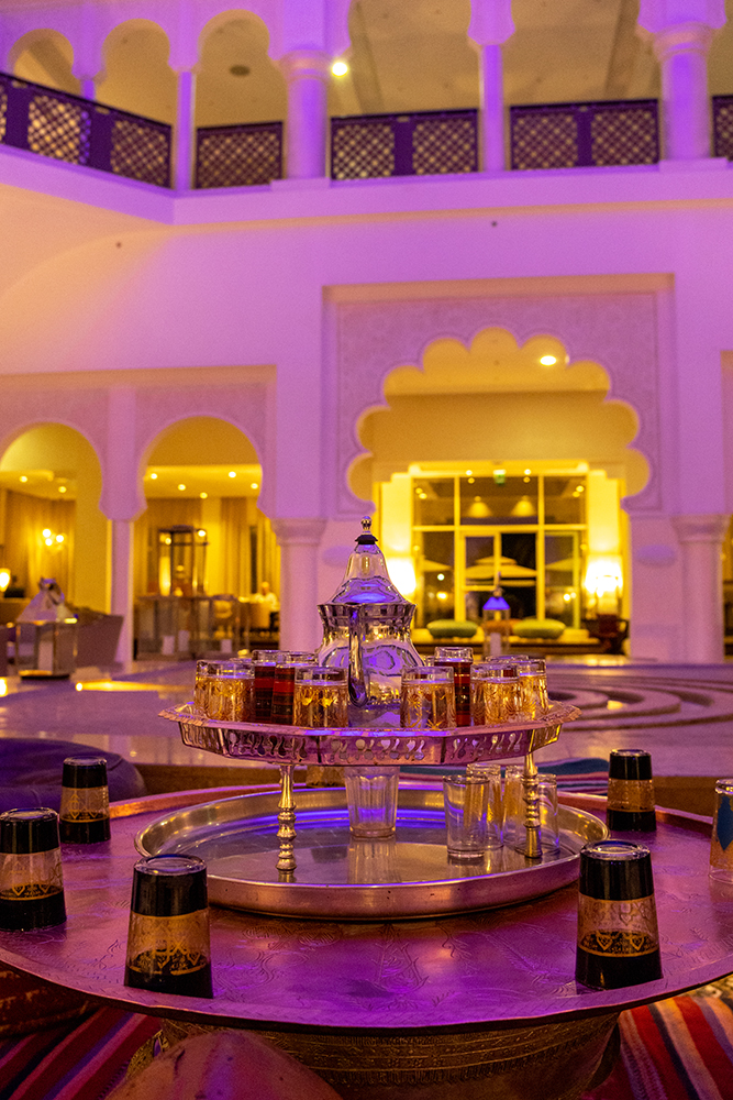 In the center of the lobby was a plush seating area in a wide, domed atrium that was open to the many floors of the hotel. At this late hour, everything was lit with purple mood lighting, and a tea service sat next to a couple of extravagant couches, ready for us to refresh ourselves with a warm herbal tea as we waited to check in.