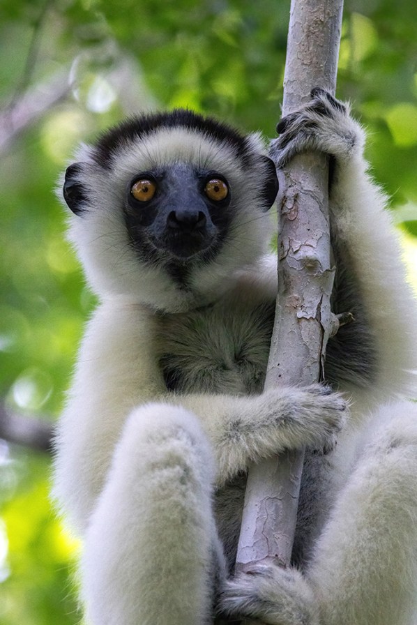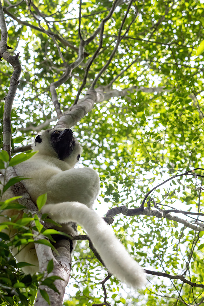 Since the lemurs were happy to keep hanging out around us, we were the ones who eventually had to decide to leave in search of the next species, and we found a handful of Verreaux’s sifakas a short distance away. These critically endangered lemurs are highly arboreal. They leap from tree to tree with ease, but if they ever find themselves on the ground, their only means of moving is by jumping. Because of this unique behavior, sifakas are often referred to as dancing lemurs, and we would get to witness this phenomenon a couple of days later.