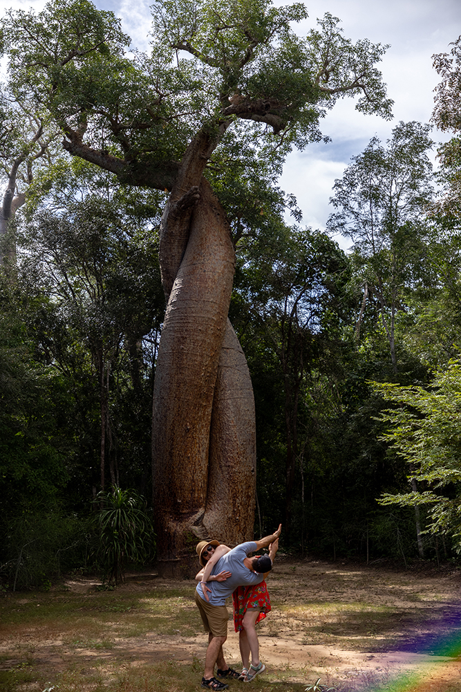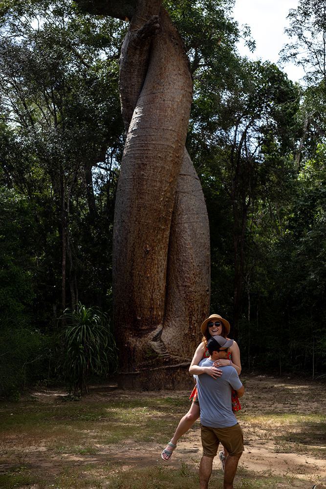 It was slow going once we were back on the flooded roadway. We plowed through headlights-deep puddles and chugged our way through thick mud. At one point, the 4×4 my family was riding in got very stuck in some deep mud. All four of us got out to help gather sticks to put under the tires for traction, and eventually our driver managed to free the vehicle as we all cheered from the side of the road. Our drivers also brought us to a couple of points of interest along the road, including a Sacred Baobab and the Baobab Amoureux, or Lovers Baobabs. This pair of trees entwined together as they grew, creating an iconic shape.