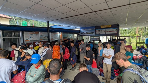 Soon PG retrieved us from the rooftop, and led us down to the check in desk of the airport, where we had to have our luggage weighed before we could get tickets. This was a chaotic process. There were so many piles of bags lying around, then we had to lift ours up and pass them along just to get them within spitting distance of the scales. In the end, the ten kilo “limit” on our duffels turned out to be more of a suggestion than a hard rule, but the five kilo limit on our day packs was strictly enforced.