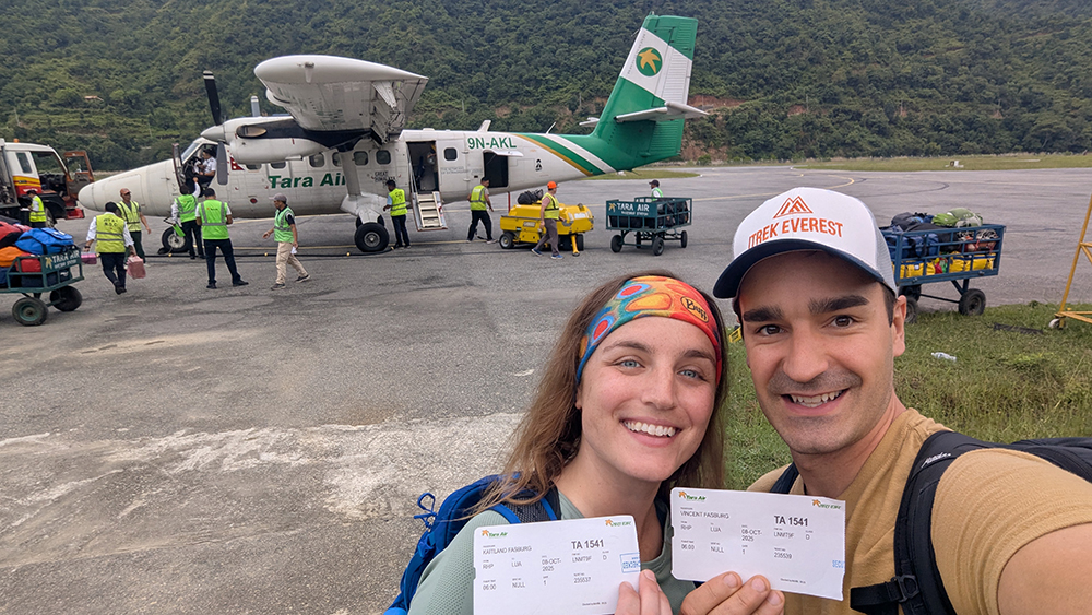 The next morning, things were looking up. We were almost guaranteed a flight today because we were only second in line for Tara Air. As we walked back to the airport, PG recommended that we try to get seats on the left side of the plane for the best views. This time, we checked in for our flight right when we arrived at the airport. Less than an hour later, we got to go out into the tarmac to board our flight!
