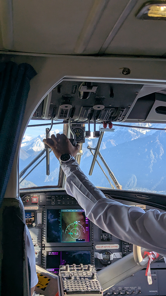 I was the first passenger onto the plane, and I grabbed the seat on the left just behind the cockpit. We all settled in, and I eagerly watched our pilots operating the plane’s controls as we lumbered along the runway and took off into the air. The little plane was surprisingly steady as we soared over the river and up up up, higher into the mountains.