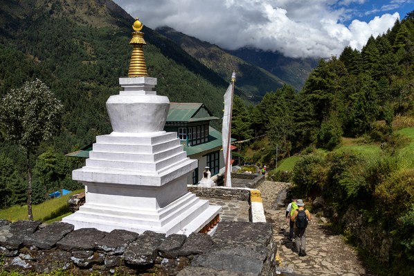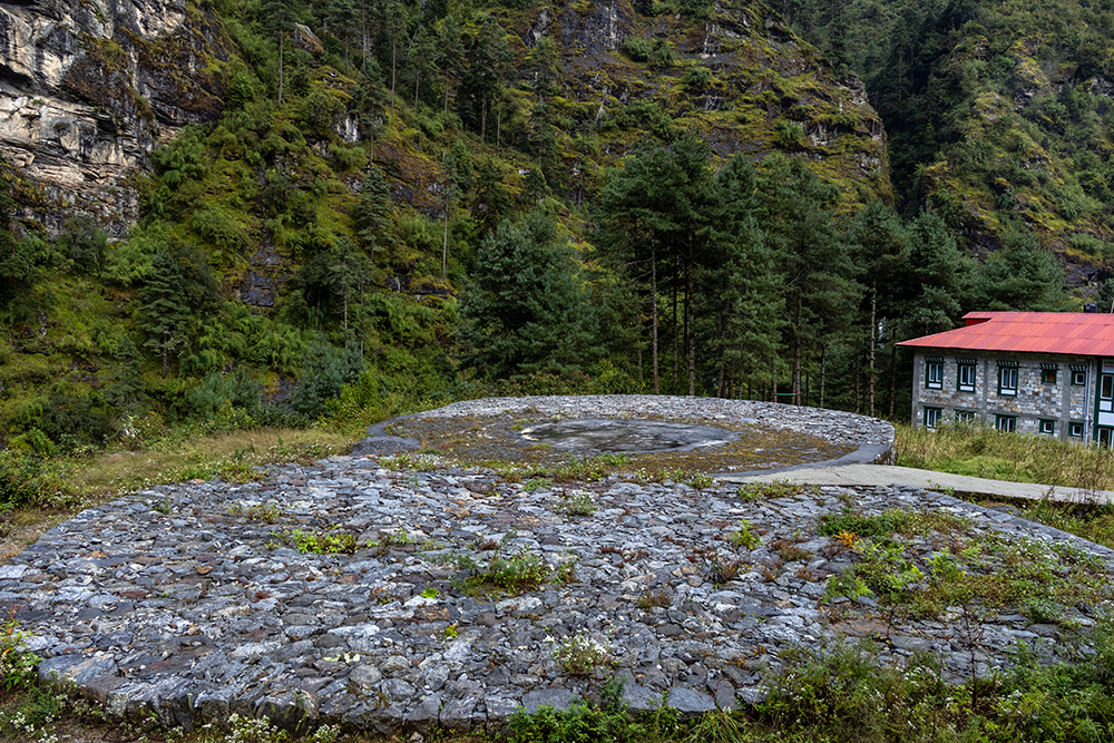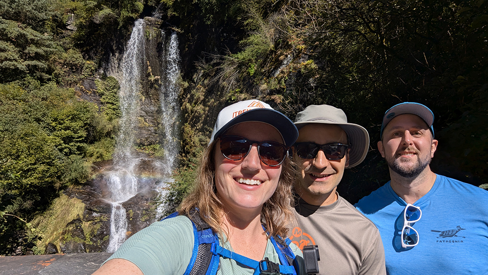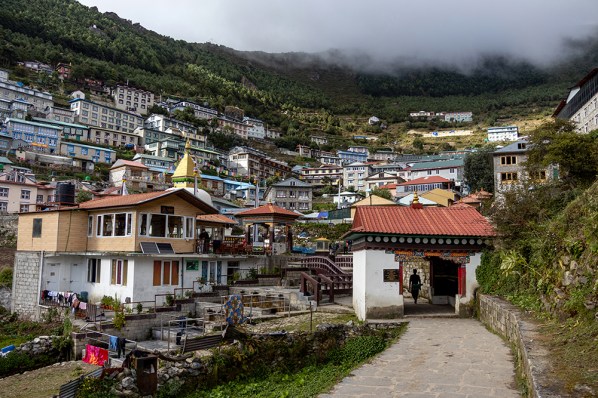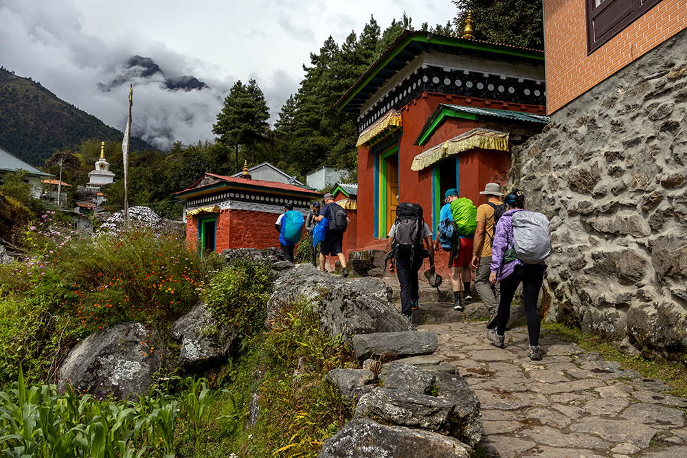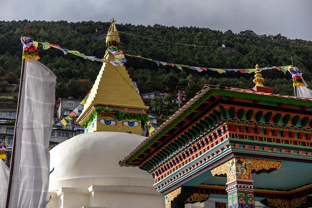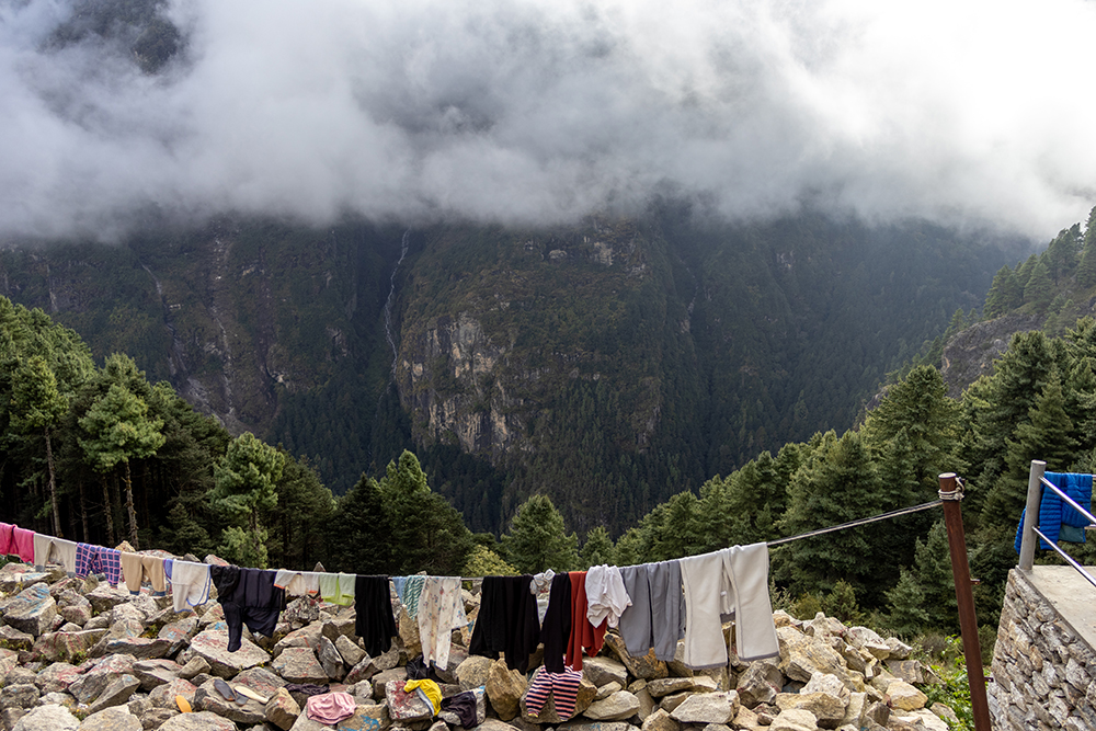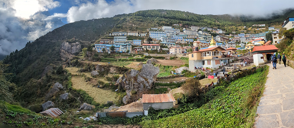 I woke up with the sun the next morning, and after a bit of drama with our floor’s bathroom (a pipe was spewing water to the point of causing a minor flood), I snuck outside to enjoy the peace and quiet for a moment before breakfast. That quiet was momentarily interrupted by the sound of a low-flying helicopter, which I would get used to over the next several days. Helicopter flyovers only increased in frequency the higher we climbed. Soon, I joined the team for breakfast, and then we hit the trail, bound for the iconic trading hub, Namche Bazaar.