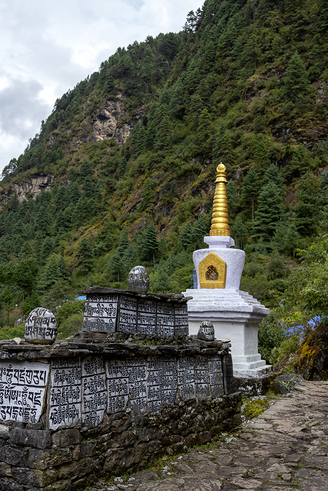 The first day of the trek would be by far the easiest. It was a short day, and almost entirely gentle, downhill terrain. I appreciated this because it was a good opportunity to ease into hiking after spending the past four days sitting around in airports, planes, and a very cramped van. Beautiful Stupas dotted the trail every so often. We also passed many Prayer Wheels and Mani Stones along the trail, and PG taught us to spin the Prayer Wheels in a clockwise direction, and always pass by the Mani Stones on the left side.