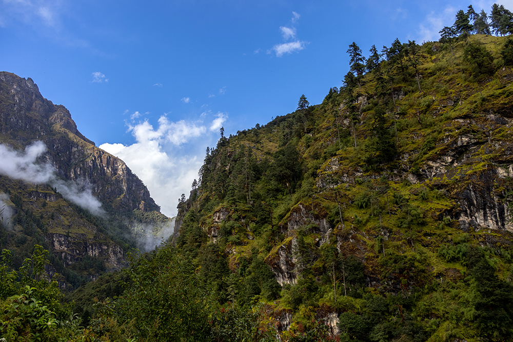 The musk deer was diminutive, and when it looked up from its grazing, I saw that it had two long tusks protruding from its top jaw. A tusked deer was a first for me, and I enjoyed the moment without trying to switch out my lenses to get pictures. I had a feeling the deer wouldn’t stick around for long, and I didn’t want to miss getting a good look at it by fiddling with my camera gear. Sure enough, another group of trekkers caught up to us, and the deer got startled and bounded uphill until it was engulfed in the forest, ending our brief, but exciting encounter.