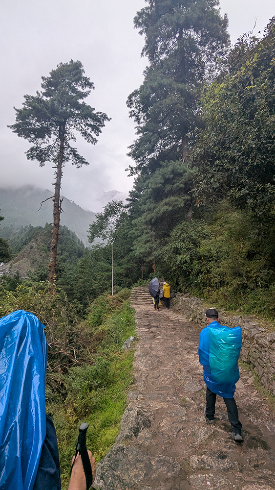 As we ate, thick cloud cover settled over us, and within minutes, thick rain drops began pelting the roof of the restaurant we’d stopped at. Luckily Vince, Thadd, and I had packed our rain jackets and rain flies for our backpacks with us that morning, but a few other members of the group had left their rain gear in their duffel bags. Thankfully, PG and Mahesh knew exactly what to do. They fashioned a few makeshift ponchos out of large sheets of plastic, and then we were off, hiking through the rain. The downpour didn’t last long, but based on the clouds that still gathered overhead, I guessed that we hadn’t seen the last of the bad weather yet.
