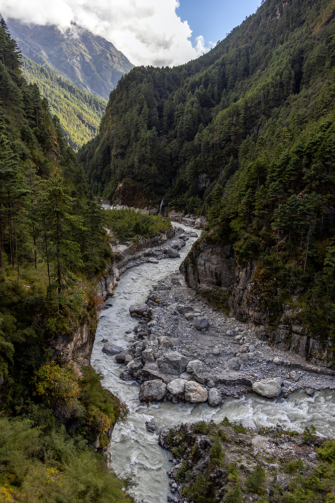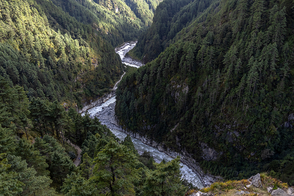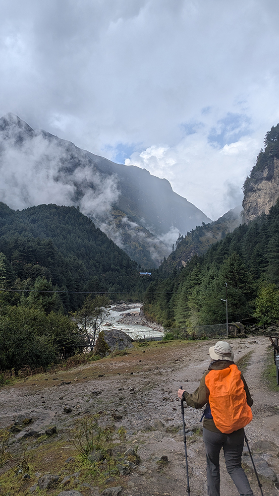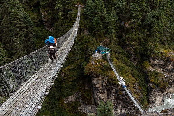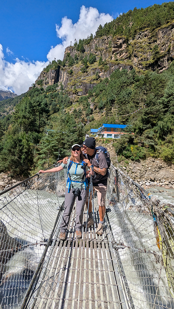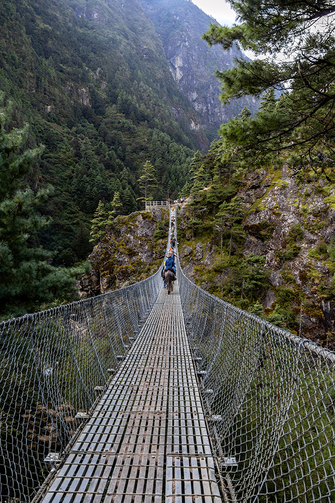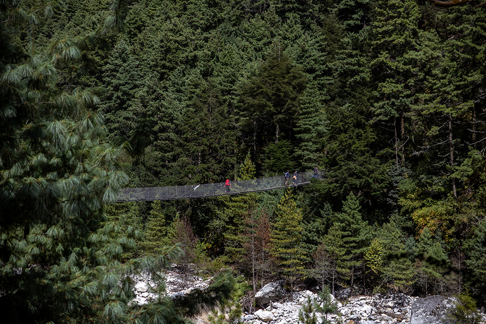 We had to cross a few more suspension bridges as we wound our way alongside the Dhudh Kosi River. A section of the trail had been washed out during the storms that blew through a few days earlier, which forced us to reroute for a bit and take a much steeper trail than the main one. But I didn’t embark on this adventure under any illusions that I wouldn’t have to climb hills, so I trodded along with the group as we inched our way higher through a dense forest. Sections of the trail were underwater, as temporary streams flowed over them. We had to hop across rocks to keep our feet dry, and when we finally reached the top of the hill, we were met with the sight of the famed Hillary Bridge.
